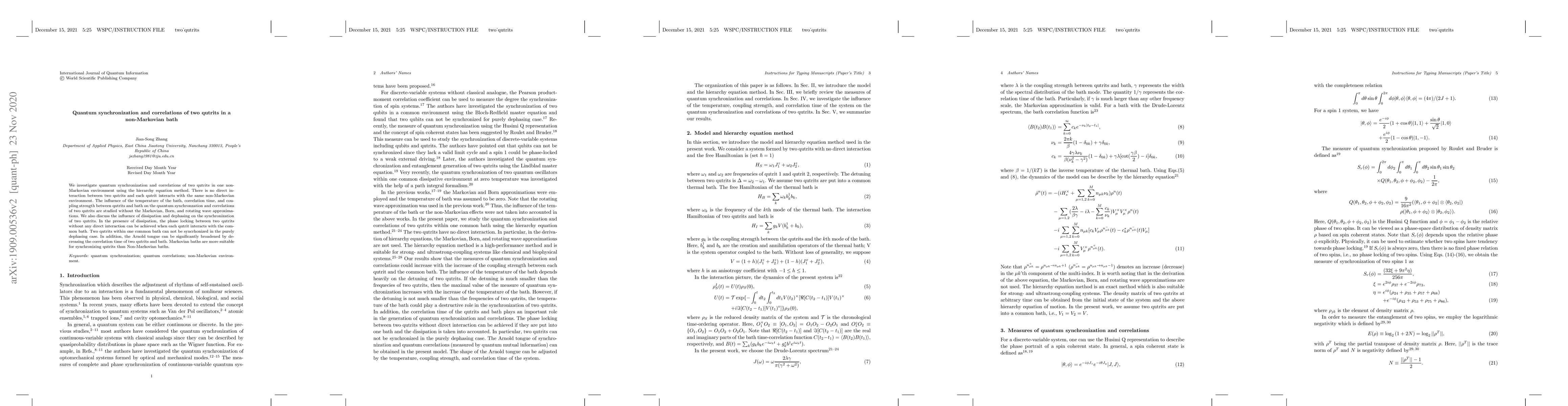 This paper explores quantum synchronization and correlations of two qutrits in a non-Markovian environment, focusing on the effects of temperature, bath correlation time, and coupling strength. It finds that synchronization can occur through interaction with the common bath, while dephasing prevents synchronization, and the Arnold tongue broadens with reduced correlation time.