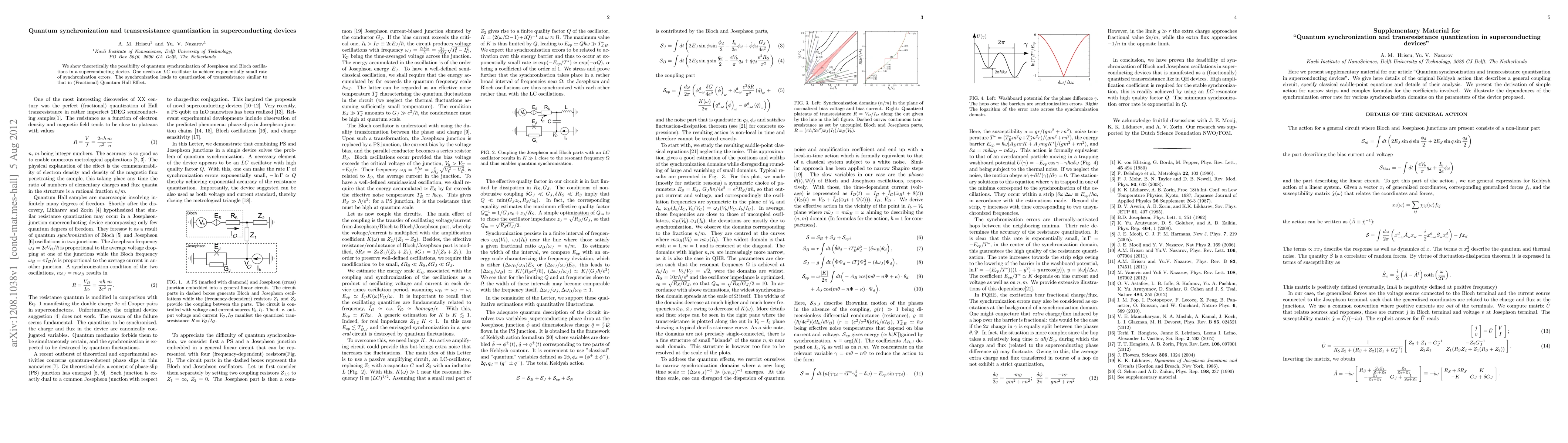 Summary: This paper theoretically demonstrates quantum synchronization of Josephson and Bloch oscillations in superconducting devices, facilitated by an $LC$ oscillator, which results in the quantization of transresistance akin to the Fractional Quantum Hall Effect.