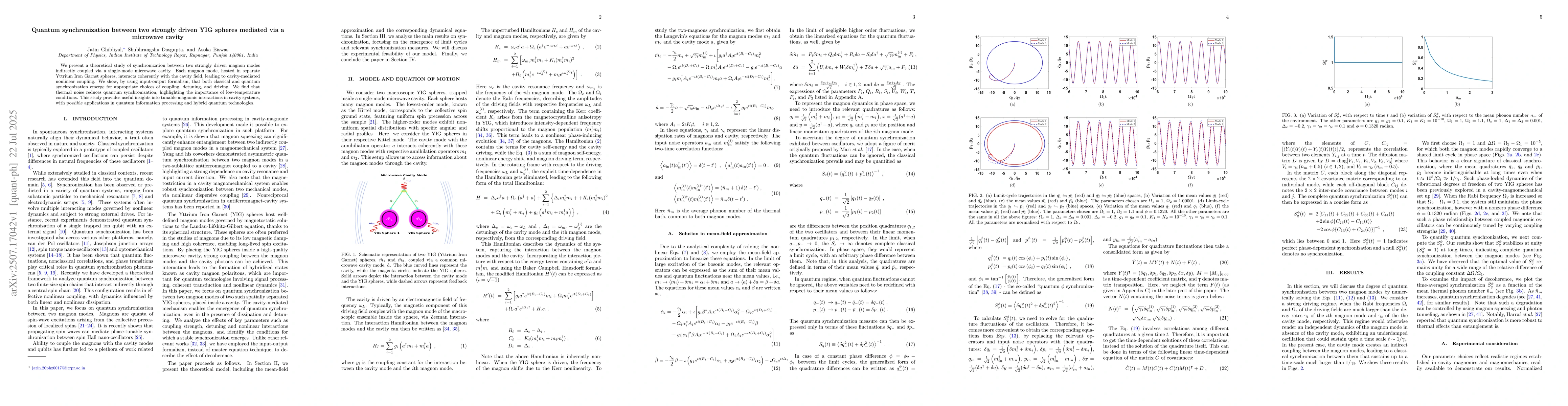 We present a theoretical study of synchronization between two strongly driven magnon modes indirectly coupled via a single-mode microwave cavity. Each magnon mode, hosted in separate Yttrium Iron Garnet spheres, interacts coherently with the cavity field, leading to cavity-mediated nonlinear coupling. We show, by using input-output formalism, that both classical and quantum synchronization emerge for appropriate choices of coupling, detuning, and driving. We find that thermal noise reduces quantum synchronization, highlighting the importance of low-temperature conditions. This study provides useful insights into tunable magnonic interactions in cavity systems, with possible applications in quantum information processing and hybrid quantum technologies.