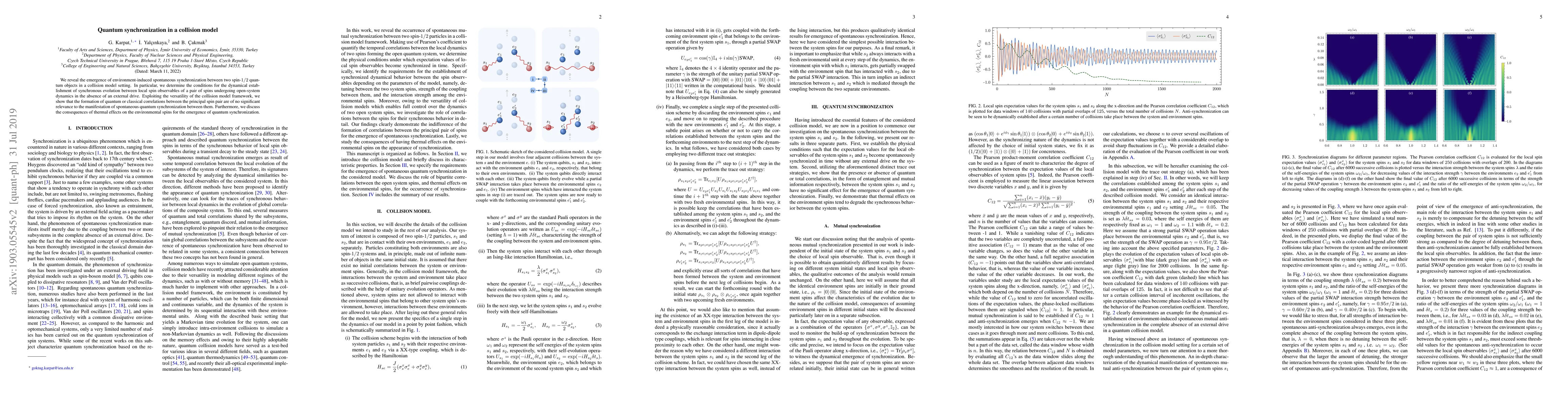 This paper explores the emergence of spontaneous synchronization between two spin-1/2 quantum objects in a collision model, revealing conditions for synchronous evolution without external drives. It demonstrates that quantum or classical correlations are not crucial for the synchronization, and discusses thermal effects on environmental spins impacting quantum synchronization.