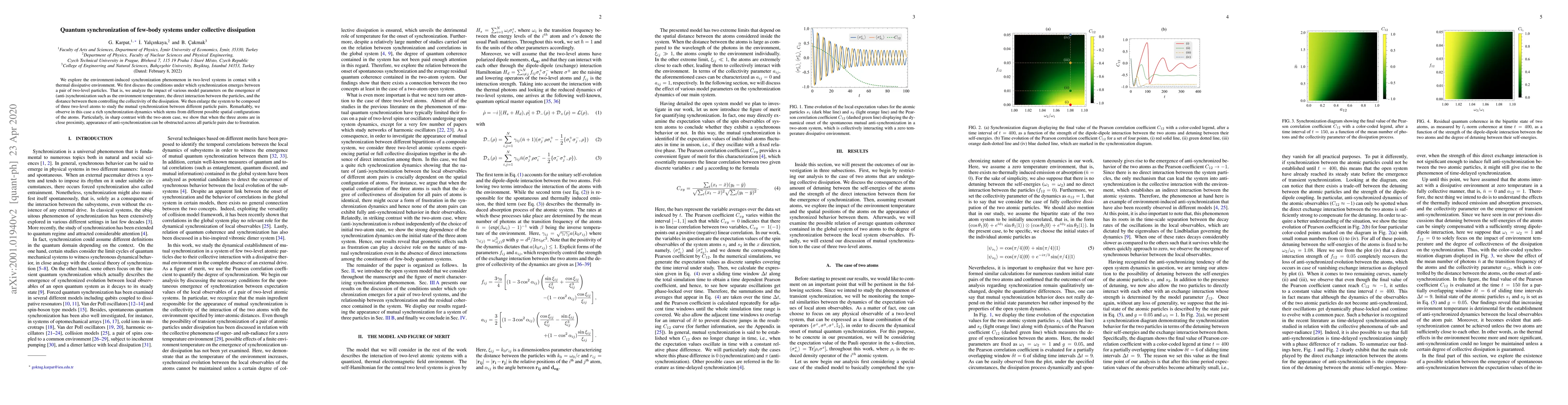 Researchers studied how quantum systems synchronize with each other when exposed to thermal dissipation, finding that three-body systems can exhibit rich synchronization dynamics due to proximity, while frustration in two-atom systems prevents anti-synchronization.