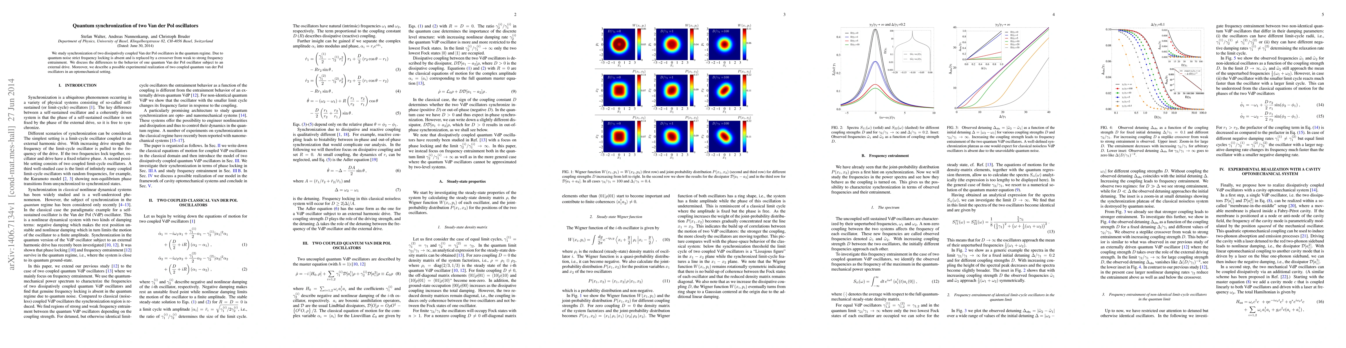This paper investigates quantum synchronization in two coupled Van der Pol oscillators, revealing a transition from weak to strong frequency entrainment instead of strict frequency locking due to quantum noise. It also contrasts this behavior with a single quantum Van der Pol oscillator under external drive and proposes an optomechanical setup for experimental realization.