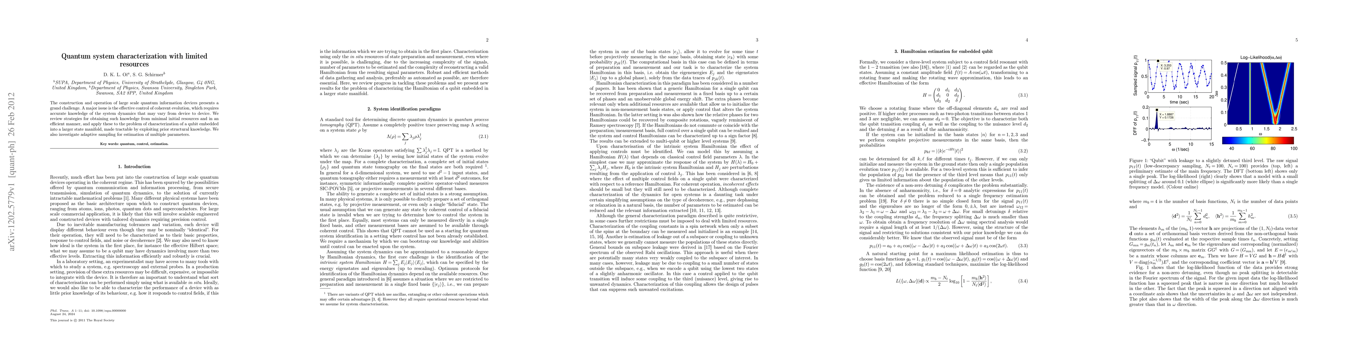 The construction and operation of large scale quantum information devices presents a grand challenge. A major issue is the effective control of coherent evolution, which requires accurate knowledge of the system dynamics that may vary from device to device. We review strategies for obtaining such knowledge from minimal initial resources and in an efficient manner, and apply these to the problem of characterization of a qubit embedded into a larger state manifold, made tractable by exploiting prior structural knowledge. We also investigate adaptive sampling for estimation of multiple parameters.