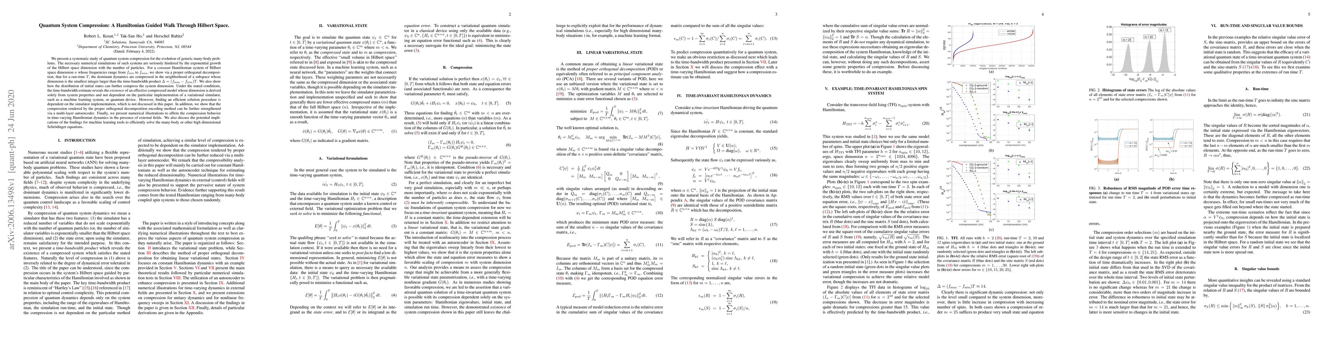 We present a systematic study of quantum system compression for the evolution of generic many-body problems. The necessary numerical simulations of such systems are seriously hindered by the exponential growth of the Hilbert space dimension with the number of particles. For a \emph{constant} Hamiltonian system of Hilbert space dimension $n$ whose frequencies range from $f_{\min}$ to $f_{\max}$, we show via a proper orthogonal decomposition, that for a run-time $T$, the dominant dynamics are compressed in the neighborhood of a subspace whose dimension is the smallest integer larger than the time-bandwidth product $\delf=(f_{\max}-f_{\min})T$. We also show how the distribution of initial states can further compress the system dimension. Under the stated conditions, the time-bandwidth estimate reveals the \emph{existence} of an effective compressed model whose dimension is derived solely from system properties and not dependent on the particular implementation of a variational simulator, such as a machine learning system, or quantum device. However, finding an efficient solution procedure \emph{is} dependent on the simulator implementation{\color{black}, which is not discussed in this paper}. In addition, we show that the compression rendered by the proper orthogonal decomposition encoding method can be further strengthened via a multi-layer autoencoder. Finally, we present numerical illustrations to affirm the compression behavior in time-varying Hamiltonian dynamics in the presence of external fields. We also discuss the potential implications of the findings for machine learning tools to efficiently solve the many-body or other high dimensional Schr{\"o}dinger equations.