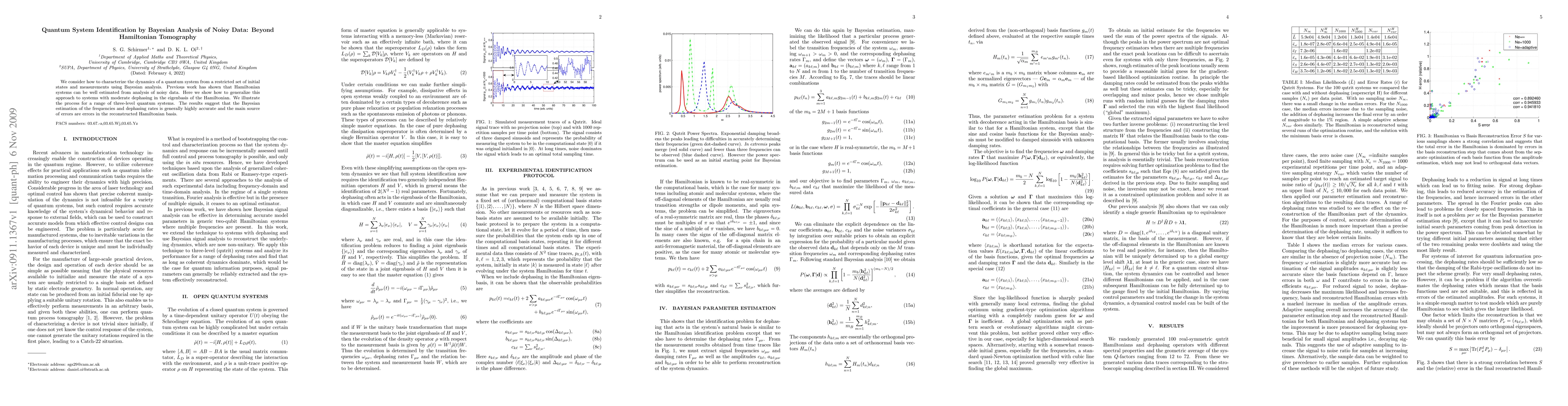 This paper proposes a Bayesian method for identifying quantum system dynamics from noisy data, extending beyond Hamiltonian tomography to account for moderate dephasing. The approach demonstrates high accuracy in estimating frequencies and dephasing rates for various three-level quantum systems, with errors primarily stemming from inaccuracies in the reconstructed Hamiltonian basis.