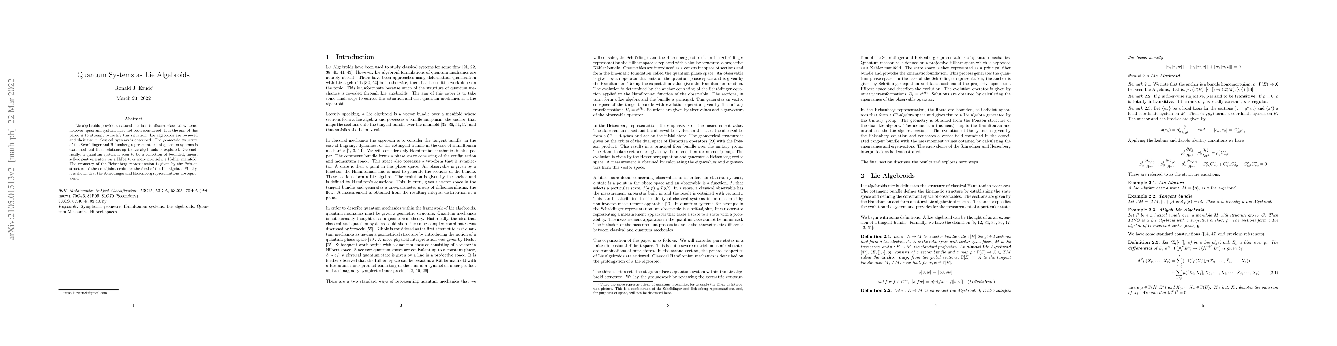 Lie algebroids provide a natural medium to discuss classical systems, however, quantum systems have not been considered. In aim of this paper is to attempt to rectify this situation. Lie algebroids are reviewed and their use in classical systems is described. The geometric structure of the Schr\"{o}dinger and Heisenberg representations of quantum systems is examined and their relationship to Lie algebroids is explored. Geometrically, a quantum system is seen to be a collection of bounded, linear, self-adjoint operators on a Hilbert, or more precisely, a K\"{a}hler manifold. The geometry of the Heisenberg representation is given by the Poisson structure of the co-adjoint orbits on the dual of the Lie algebra. Finally, it is shown that the Schr\"{o}dinger and Heisenberg representations are equivalent.