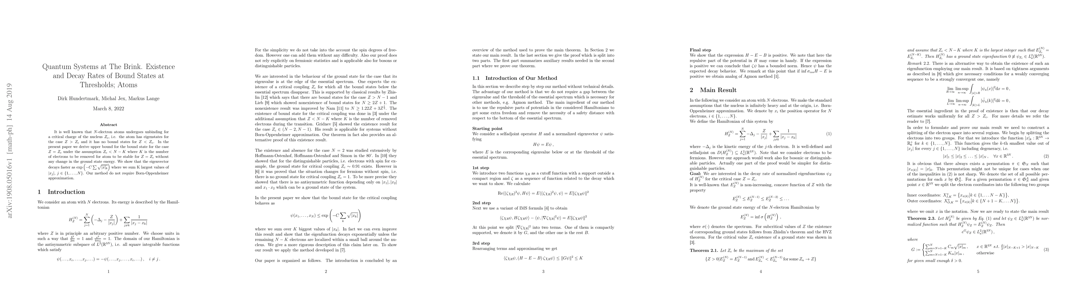 This paper investigates the decay rates of bound states in $N$-electron atoms at the critical charge $Z_c$ where unbinding occurs, deriving an upper bound for these states under the condition $Z_c < N-K$. It demonstrates that the eigenvector decays exponentially fast, without relying on the Born-Oppenheimer approximation.