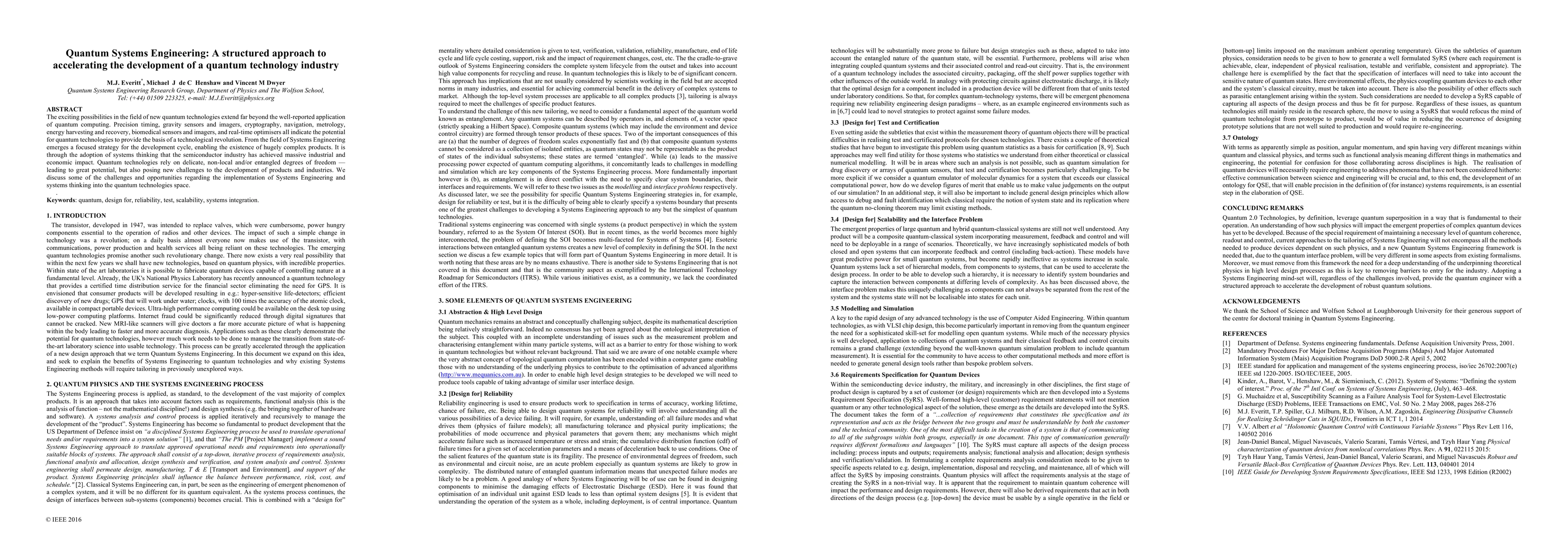 The exciting possibilities in the field of new quantum technologies extend far beyond the well-reported application of quantum computing. Precision timing, gravity sensors and imagers, cryptography, navigation, metrology, energy harvesting and recovery, biomedical sensors and imagers, and real-time optimisers all indicate the potential for quantum technologies to provide the basis of a technological revolution. From the field of Systems Engineering emerges a focused strategy for the development cycle, enabling the existence of hugely complex products. It is through the adoption of systems thinking that the semiconductor industry has achieved massive industrial and economic impact. Quantum technologies rely on delicate, non-local and/or entangled degrees of freedom - leading to great potential, but also posing new challenges to the development of products and industries. We discuss some of the challenges and opportunities regarding the implementation of Systems Engineering and systems thinking into the quantum technologies space.