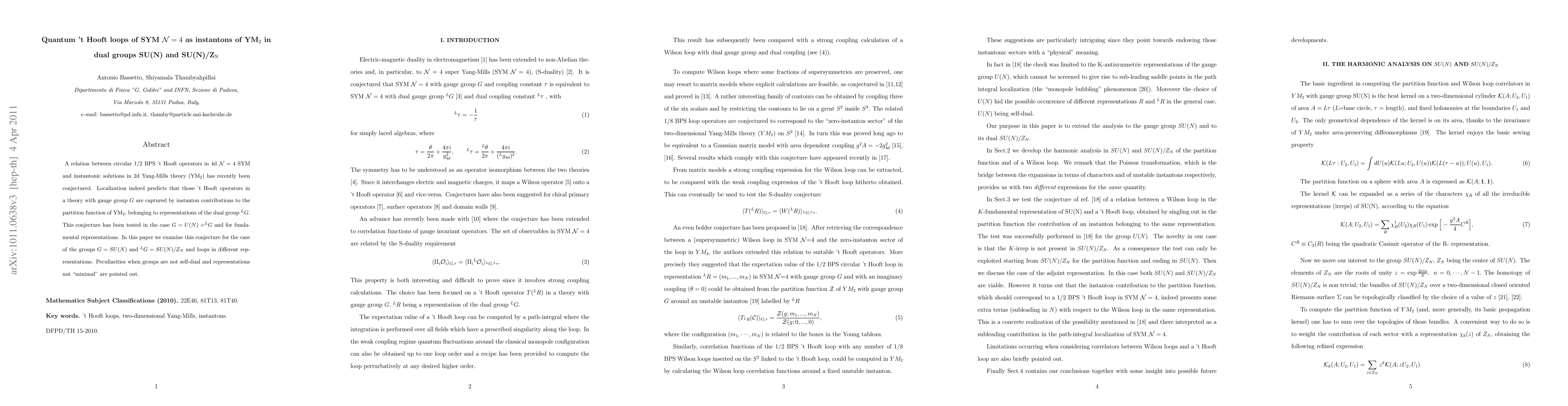 This paper investigates the conjecture linking 1/2 BPS 't Hooft loops in 4d N=4 SYM to instantons in 2d Yang-Mills theory, focusing on SU(N) and its dual group SU(N)/Z_N. It highlights unique features when examining non-self-dual groups and non-minimal representations.