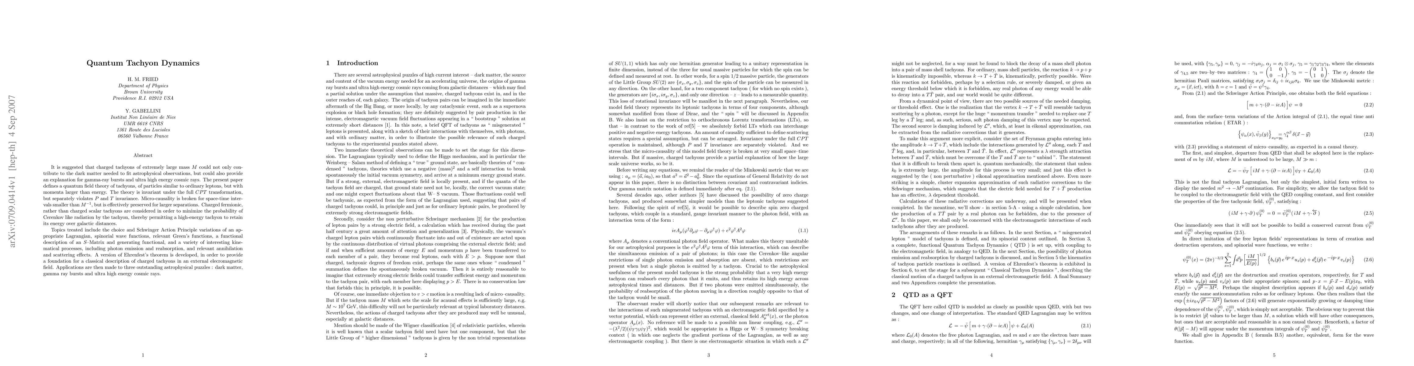 It is suggested that charged tachyons of extremely large mass M could not only contribute to the dark matter needed to fit astrophysical observations, but could also provide an explanation for gamma ray bursts and ulta high energy cosmic rays. The present paper defines a quantum field theory of tachyons, particles similar to ordinary leptons, but with momenta larger than energy. The theory is invariant under the full CPT transformation, but separately violates P and T invariance. Micro causality is broken for space-time intervals smaller than 1/M, but is effectively preserved for larger separations. Charged fermionic, rather than charged scalar tachyons are considered in order to minimize the probability of Cerenkov-like radiation by the tachyon, thereby permitting a high energy tachyon to retain its energy over galactic distances. Topics treated include the choice and Schwinger Action Principle variations of an appropriate Lagrangian, spinorial wave functions, relevant Green's functions, a functional description of an S-Matrix and generating functional, and a variety of interesting kinematical processes, including photon emission and reabsorption, and relevant annihilation and scattering effects. A version of Ehrenfest's theorem is developed, in order to provide a foundation for a classical description of charged tachyons in an external electromagnetic field. Applications are then made to three outstanding astrophysical puzzles : dark matter, gamma ray bursts and ultra high energy cosmic rays.