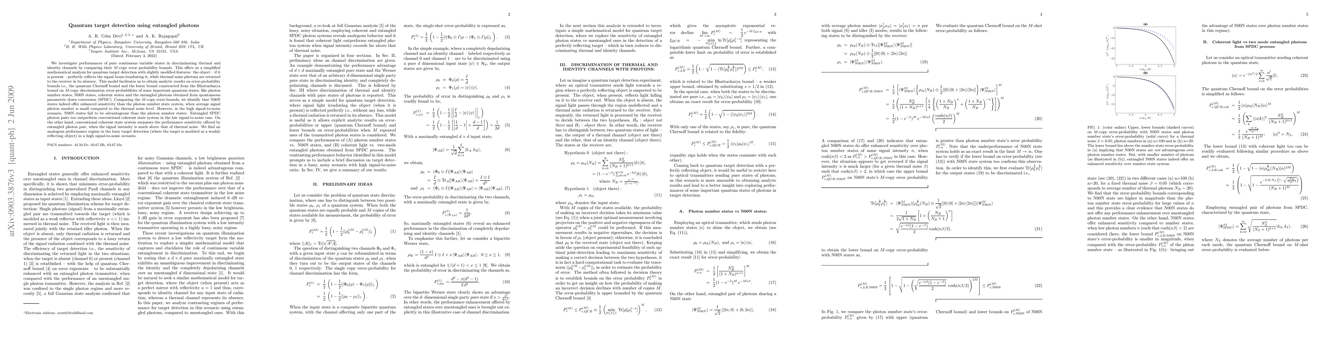 This paper examines the performance of various quantum states in detecting a perfectly reflecting target amidst thermal noise, using M-copy error probability bounds. It finds that N00N states outperform photon number states in low signal-to-noise scenarios, while coherent states are superior in high signal-to-noise conditions. Entangled SPDC photons also show better detection in low signal-to-noise situations compared to coherent states.