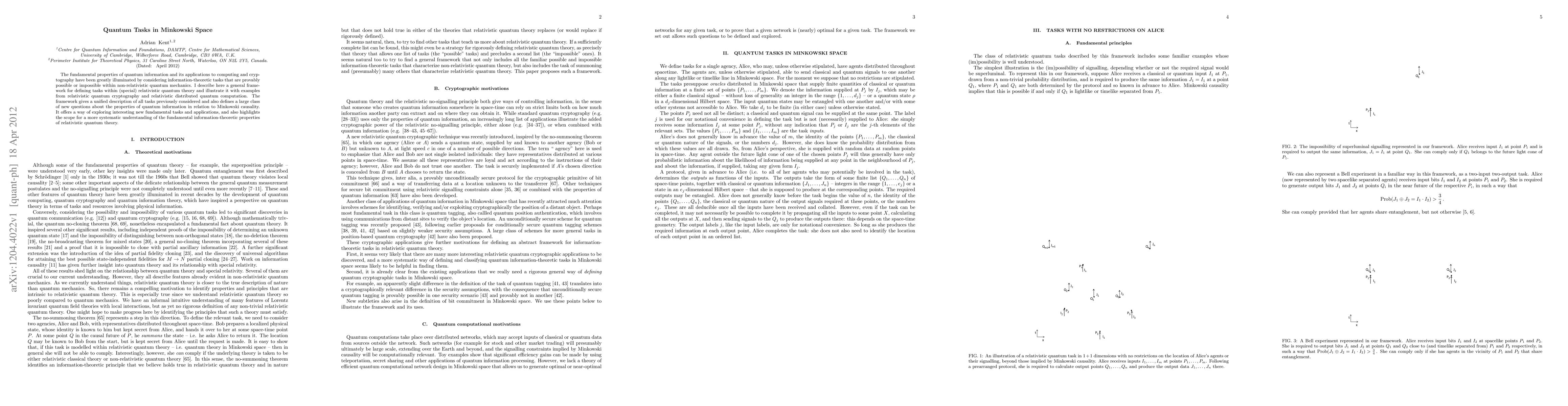 The fundamental properties of quantum information and its applications to computing and cryptography have been greatly illuminated by considering information-theoretic tasks that are provably possible or impossible within non-relativistic quantum mechanics. I describe here a general framework for defining tasks within (special) relativistic quantum theory and illustrate it with examples from relativistic quantum cryptography and relativistic distributed quantum computation. The framework gives a unified description of all tasks previously considered and also defines a large class of new questions about the properties of quantum information in relation to Minkowski causality. It offers a way of exploring interesting new fundamental tasks and applications, and also highlights the scope for a more systematic understanding of the fundamental information-theoretic properties of relativistic quantum theory.