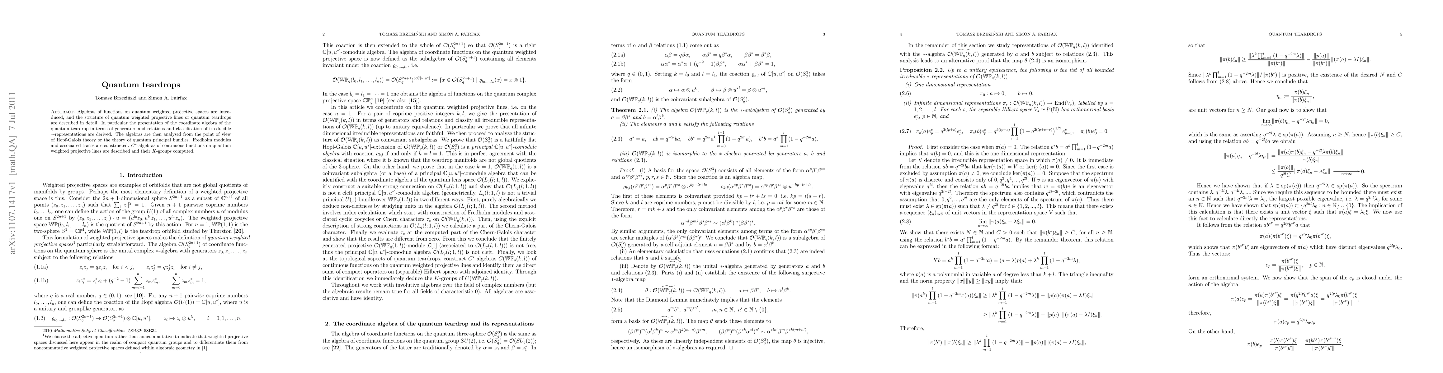 This paper introduces algebras of functions on quantum weighted projective spaces, focusing on quantum teardrops. It presents the coordinate algebra of quantum teardrops and classifies their irreducible *-representations, analyzing them via Hopf-Galois theory and quantum principal bundles, and computes their K-groups.