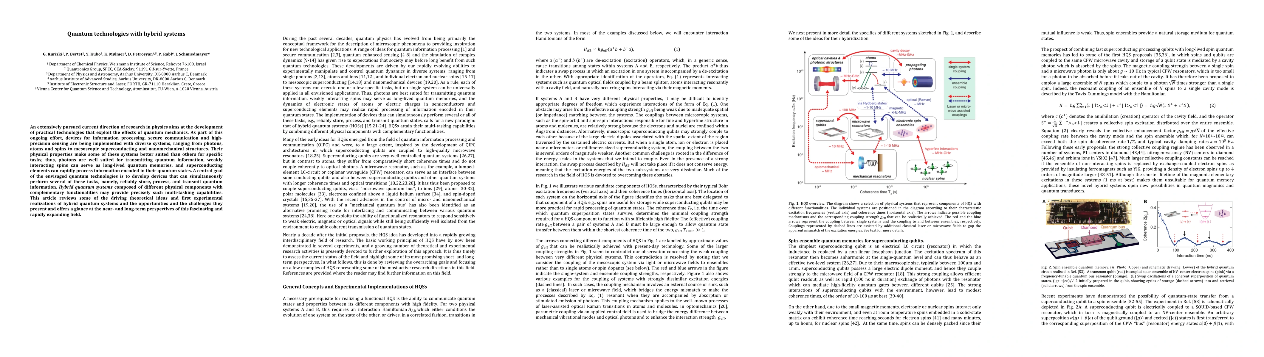 An extensively pursued current direction of research in physics aims at the development of practical technologies that exploit the effects of quantum mechanics. As part of this ongoing effort, devices for information processing, secure communication and high-precision sensing are being implemented with diverse systems, ranging from photons, atoms and spins to mesoscopic superconducting and nanomechanical structures. Their physical properties make some of these systems better suited than others for specific tasks; thus, photons are well suited for transmitting quantum information, weakly interacting spins can serve as long-lived quantum memories, and superconducting elements can rapidly process information encoded in their quantum states. A central goal of the envisaged quantum technologies is to develop devices that can simultaneously perform several of these tasks, namely, reliably store, process, and transmit quantum information. Hybrid quantum systems composed of different physical components with complementary functionalities may provide precisely such multi-tasking capabilities. This article reviews some of the driving theoretical ideas and first experimental realizations of hybrid quantum systems and the opportunities and the challenges they present and offers a glance at the near- and long-term perspectives of this fascinating and rapidly expanding field.