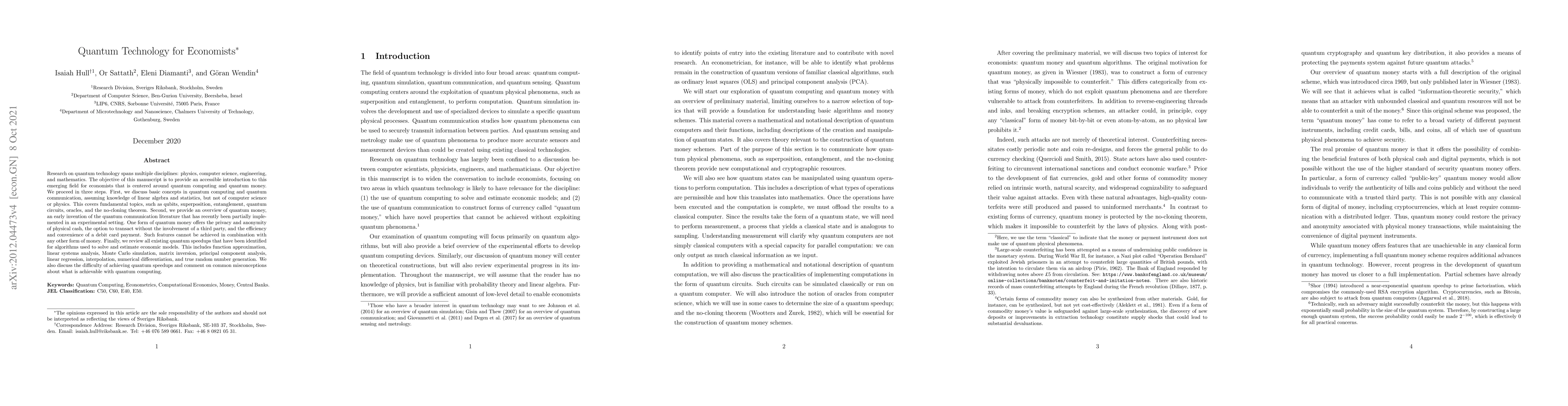 Research on quantum technology spans multiple disciplines: physics, computer science, engineering, and mathematics. The objective of this manuscript is to provide an accessible introduction to this emerging field for economists that is centered around quantum computing and quantum money. We proceed in three steps. First, we discuss basic concepts in quantum computing and quantum communication, assuming knowledge of linear algebra and statistics, but not of computer science or physics. This covers fundamental topics, such as qubits, superposition, entanglement, quantum circuits, oracles, and the no-cloning theorem. Second, we provide an overview of quantum money, an early invention of the quantum communication literature that has recently been partially implemented in an experimental setting. One form of quantum money offers the privacy and anonymity of physical cash, the option to transact without the involvement of a third party, and the efficiency and convenience of a debit card payment. Such features cannot be achieved in combination with any other form of money. Finally, we review all existing quantum speedups that have been identified for algorithms used to solve and estimate economic models. This includes function approximation, linear systems analysis, Monte Carlo simulation, matrix inversion, principal component analysis, linear regression, interpolation, numerical differentiation, and true random number generation. We also discuss the difficulty of achieving quantum speedups and comment on common misconceptions about what is achievable with quantum computing.