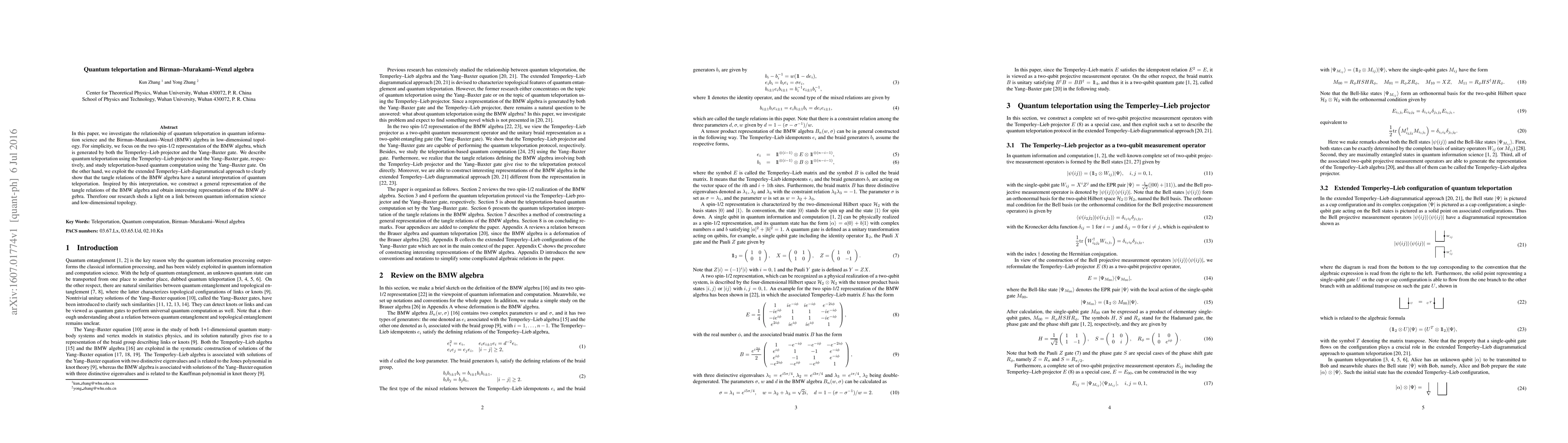 In this paper, we investigate the relationship of quantum teleportation in quantum information science and the Birman-Murakami-Wenzl (BMW) algebra in low-dimensional topology. For simplicity, we focus on the two spin-1/2 representation of the BMW algebra, which is generated by both the Temperley-Lieb projector and the Yang-Baxter gate. We describe quantum teleportation using the Temperley-Lieb projector and the Yang-Baxter gate, respectively, and study teleportation-based quantum computation using the Yang-Baxter gate. On the other hand, we exploit the extended Temperley-Lieb diagrammatical approach to clearly show that the tangle relations of the BMW algebra have a natural interpretation of quantum teleportation. Inspired by this interpretation, we construct a general representation of the tangle relations of the BMW algebra and obtain interesting representations of the BMW algebra. Therefore our research sheds a light on a link between quantum information science and low-dimensional topology.