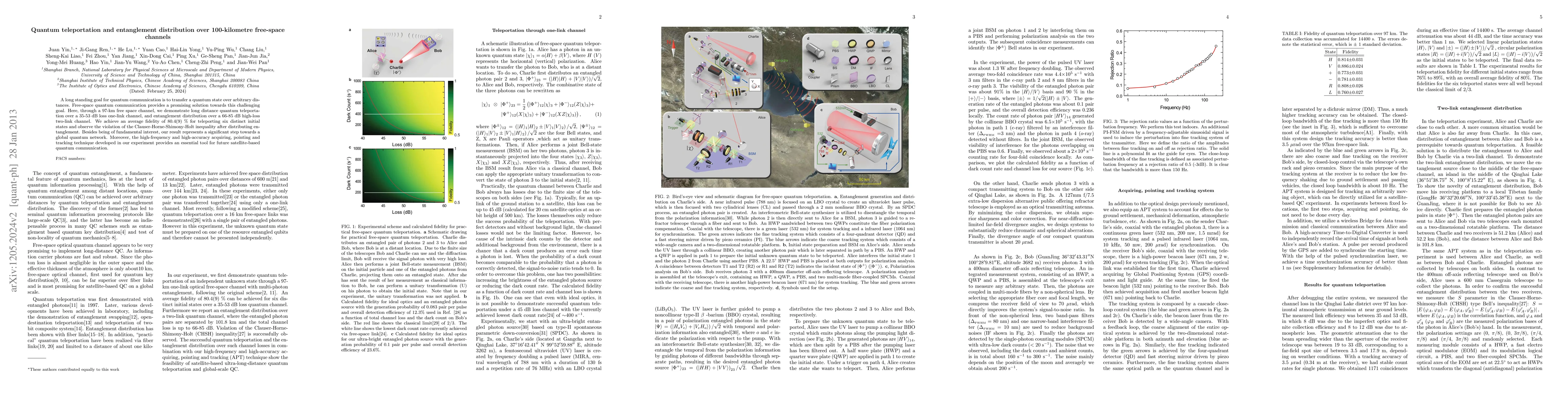 This paper demonstrates successful quantum teleportation and entanglement distribution over a 97-km free-space channel, achieving an average fidelity of 80.4(9)% and violating the CHSH inequality, marking a significant step towards global quantum networks and advancing satellite-based quantum communication techniques.
