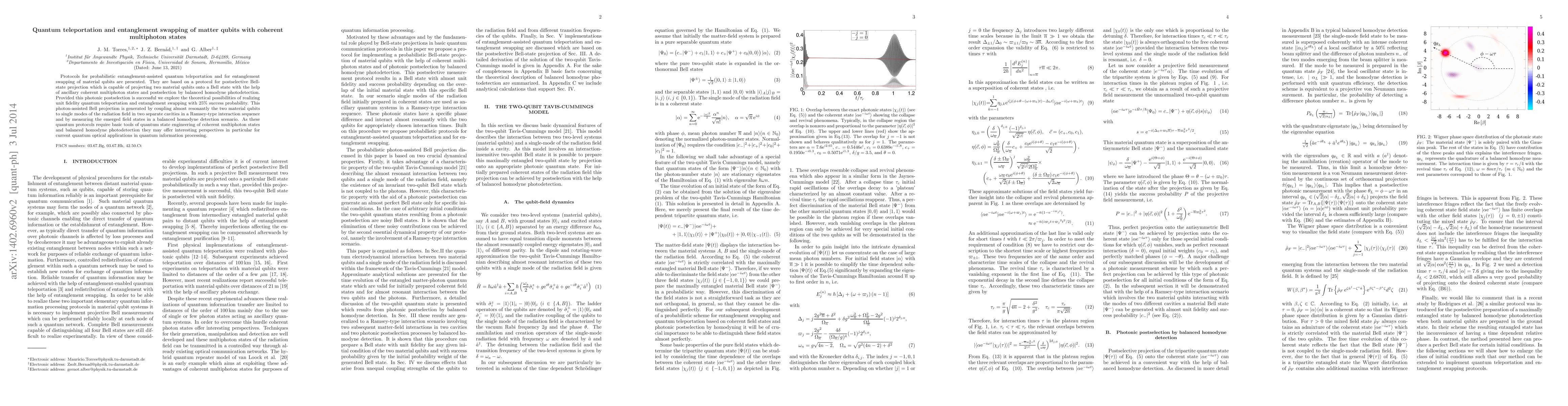 This paper presents protocols for probabilistic quantum teleportation and entanglement swapping of material qubits using coherent multiphoton states and balanced homodyne photodetection. The proposed method achieves unit fidelity teleportation and entanglement swapping with a 25% success rate, leveraging postselective Bell-state projection and Ramsey-type interactions.