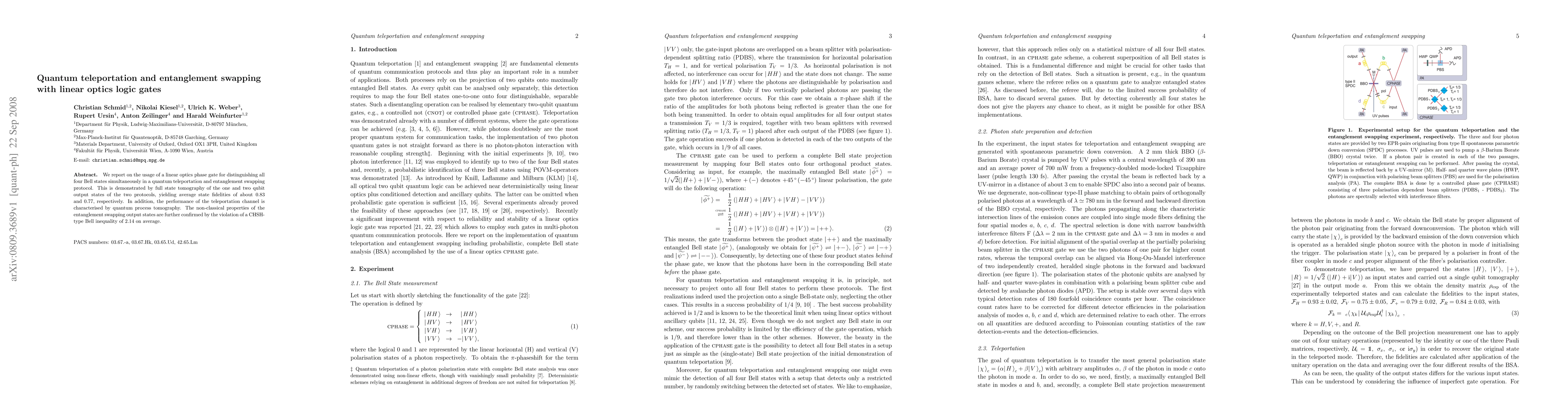 We report on the usage of a linear optics phase gate for distinguishing all four Bell states simultaneously in a quantum teleportation and entanglement swapping protocol. This is demonstrated by full state tomography of the one and two qubit output states of the two protocols, yielding average state fidelities of about 0.83 and 0.77, respectively. In addition, the performance of the teleportation channel is characterised by quantum process tomography. The non classical properties of the entanglement swapping output states are further confirmed by the violation of a CHSH-type Bell inequality of 2.14 on average.
