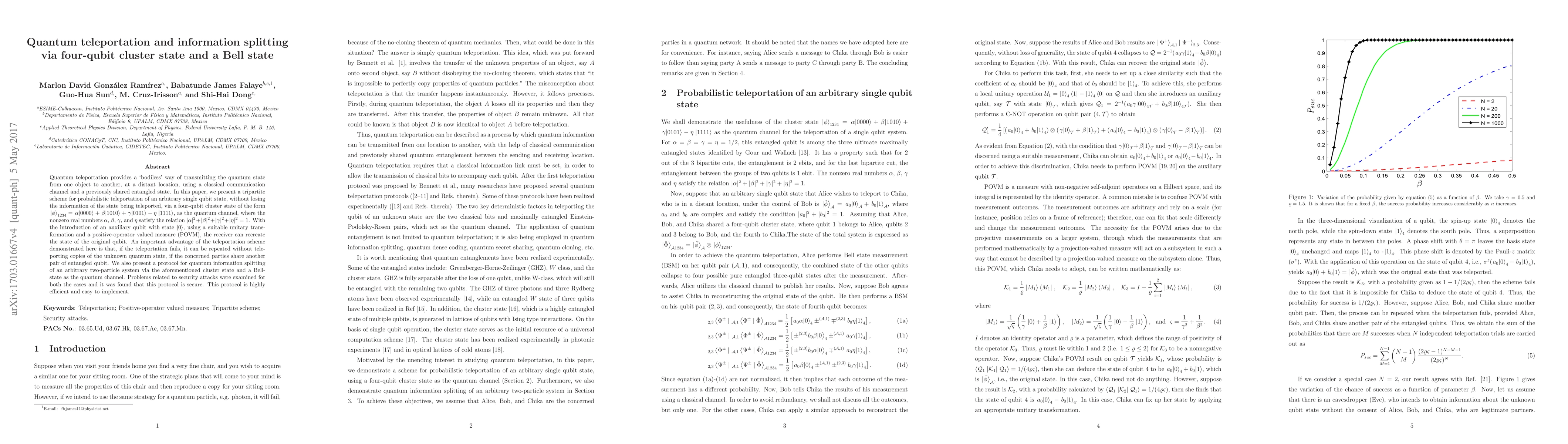 This paper proposes a tripartite scheme for probabilistic quantum teleportation using a four-qubit cluster state and a Bell state, ensuring no loss of information. It also introduces a protocol for quantum information splitting, demonstrating security against attacks and ease of implementation.