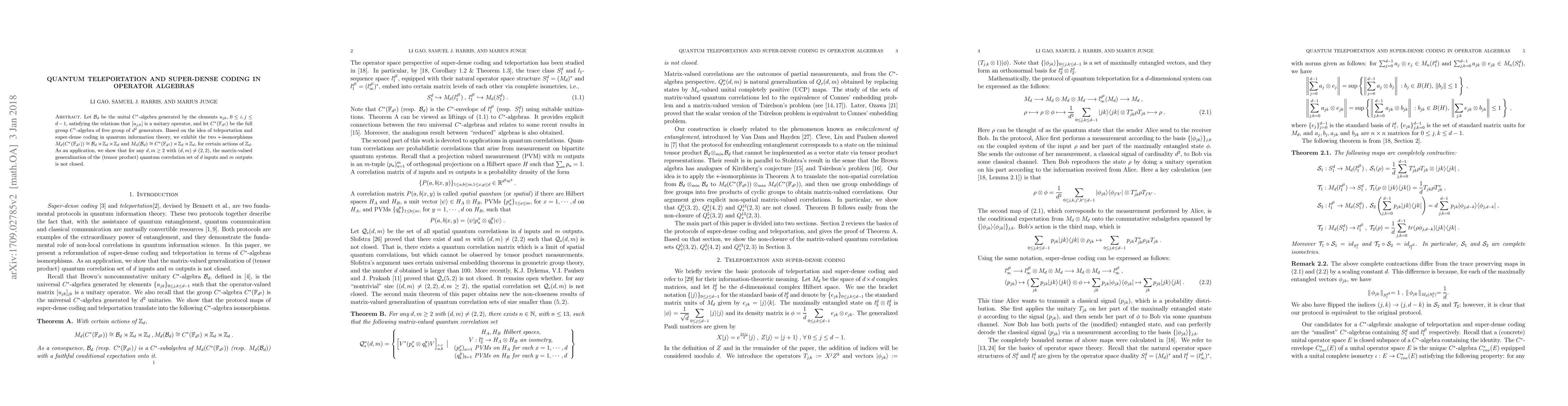 Let $\mathcal{B}_d$ be the unital $C^*$-algebra generated by the elements $u_{jk}, \, 0 \le i, j \le d-1$, satisfying the relations that $[u_{j,k}]$ is a unitary operator, and let $C^*(\mathbb{F}_{d^2})$ be the full group $C^*$-algebra of free group of $d^2$ generators. Based on the idea of teleportation and super-dense coding in quantum information theory, we exhibit the two $*$-isomorphisms $M_d(C^*(\mathbb{F}_{d^2}))\cong \mathcal{B}_d\rtimes \mathbb{Z}_d\rtimes \mathbb{Z}_d$ and $M_d(\mathcal{B}_d)\cong C^*(\mathbb{F}_{d^2})\rtimes \mathbb{Z}_d\rtimes \mathbb{Z}_d$, for certain actions of $\mathbb{Z}_d$. As an application, we show that for any $d,m\ge 2$ with $(d,m)\neq (2,2)$, the matrix-valued generalization of the (tensor product) quantum correlation set of $d$ inputs and $m$ outputs is not closed.