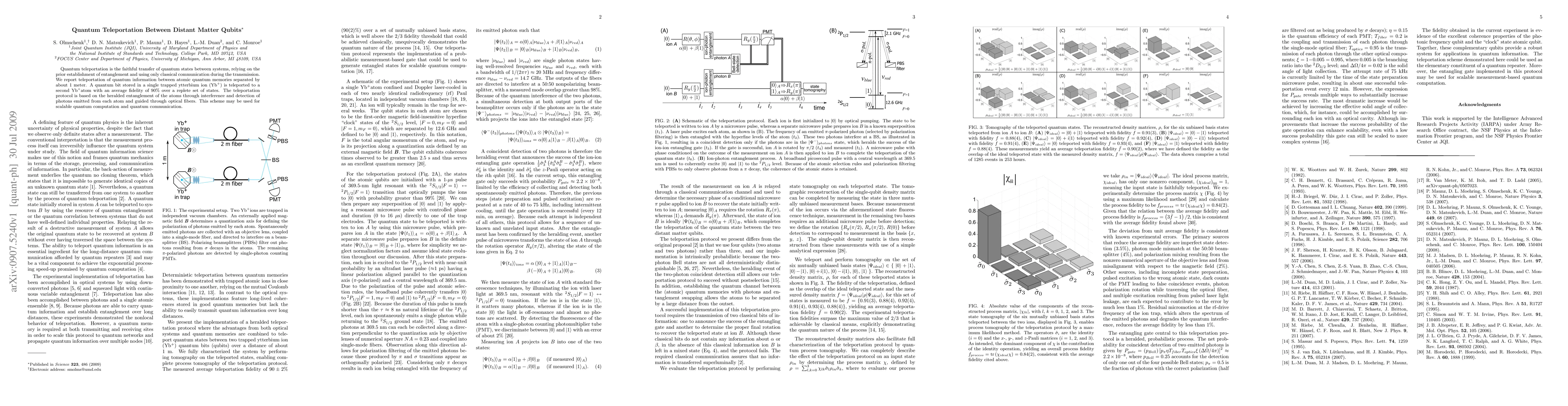 This paper reports the successful teleportation of quantum information between two trapped ytterbium ions separated by 1 meter, achieving an average fidelity of 90%. The process utilizes entangled atomic states and photon interference, paving the way for scalable quantum computation and communication.