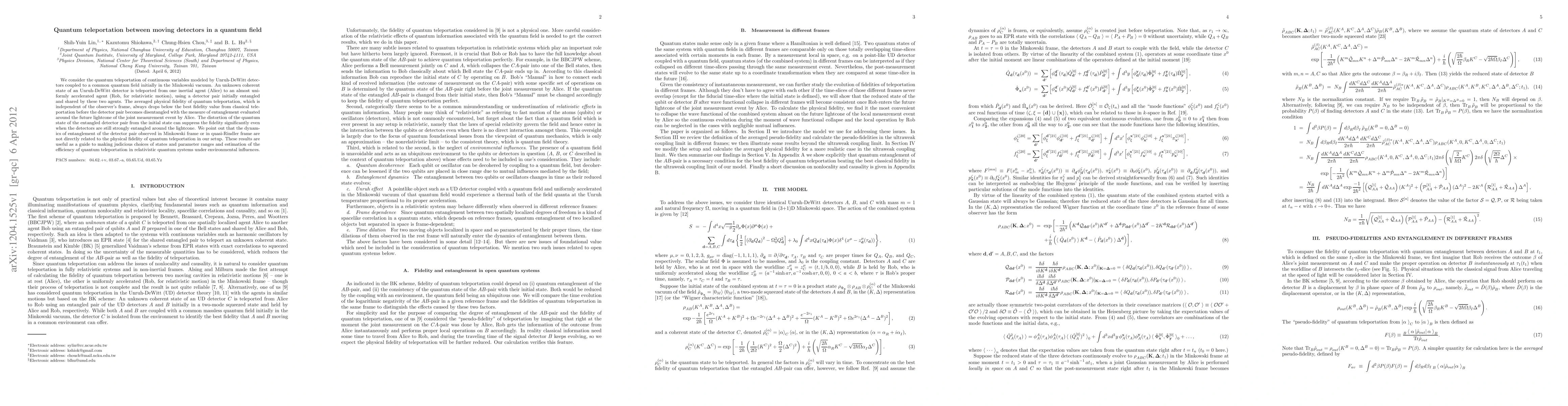 This paper investigates quantum teleportation of continuous variables between moving detectors in a quantum field, showing that the fidelity drops below classical values due to state distortion, regardless of the observer's frame. The dynamics of entanglement do not directly correlate with teleportation fidelity, providing insights for optimizing quantum teleportation efficiency in relativistic systems.