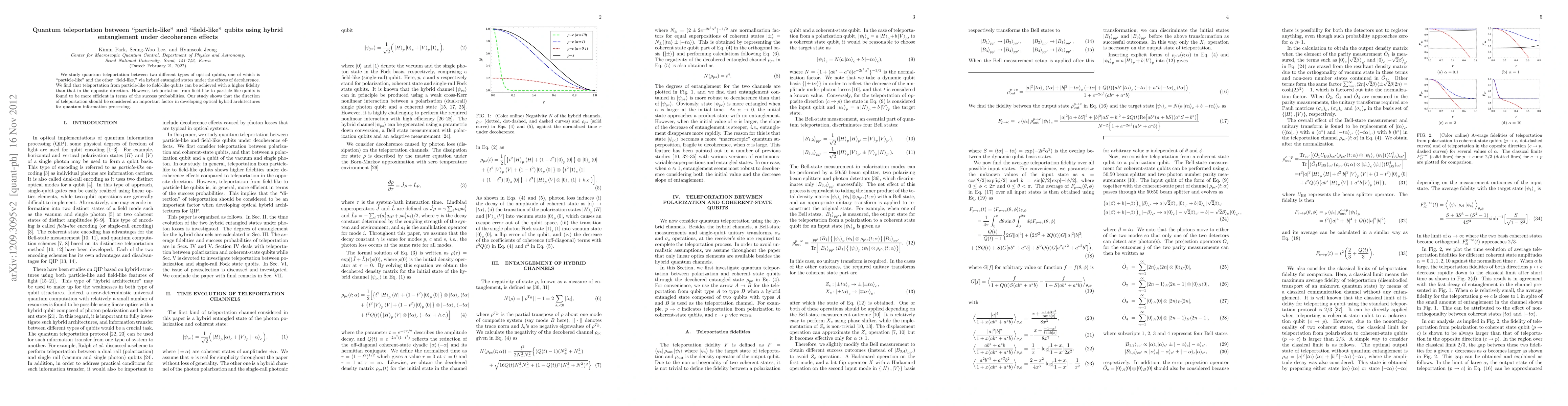We study quantum teleportation between two different types of optical qubits, one of which is "particle-like" and the other "field-like," via hybrid entangled states under the effects of decoherence. We find that teleportation from particle-like to field-like qubits can be achieved with a higher fidelity than that in the opposite direction. However, teleportation from field-like to particle-like qubits is found to be more efficient in terms of the success probabilities. Our study shows that the direction of teleportation should be considered an important factor in developing optical hybrid architectures for quantum information processing.