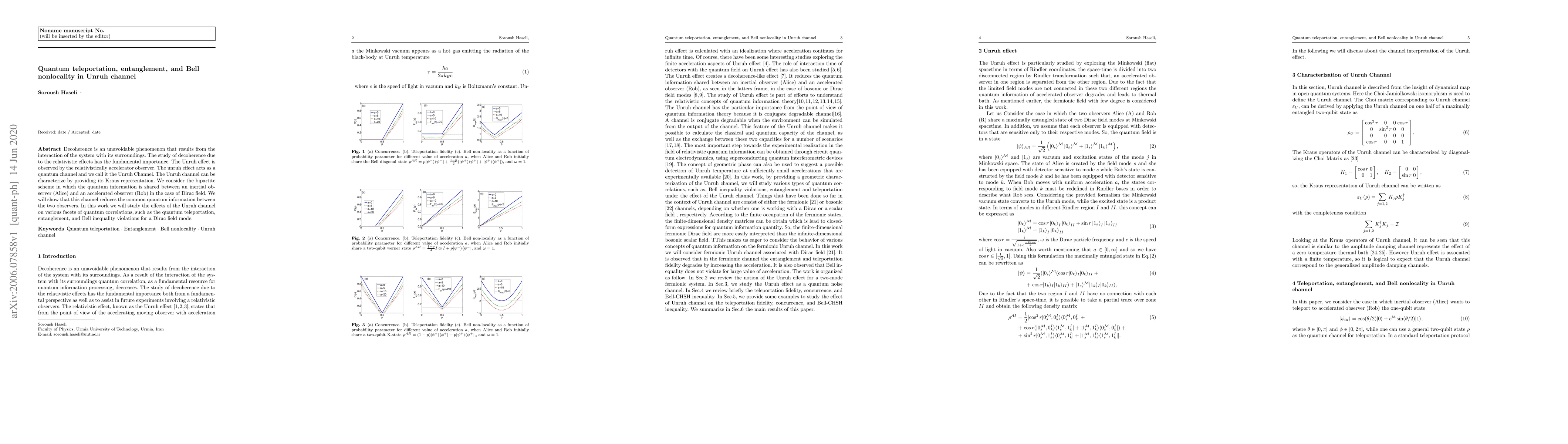 Decoherence is an unavoidable phenomenon that results from the interaction of the system with its surroundings. The study of decoherence due to the relativistic effects has the fundamental importance. The Unruh effect is observed by the relativistically accelerator observer. The unruh effect acts as a quantum channel and we call it the Unruh Channel. The Unruh channel can be characterize by providing its Kraus representation. We consider the bipartite scheme in which the quantum information is shared between an inertial observer (Alice) and an accelerated observer (Rob) in the case of Dirac field. We will show that this channel reduces the common quantum information between the two observers. In this work we will study the effects of the Unruh channel on various facets of quantum correlations, such as the quantum teleportation, entanglement, and Bell inequality violations for a Dirac field mode.