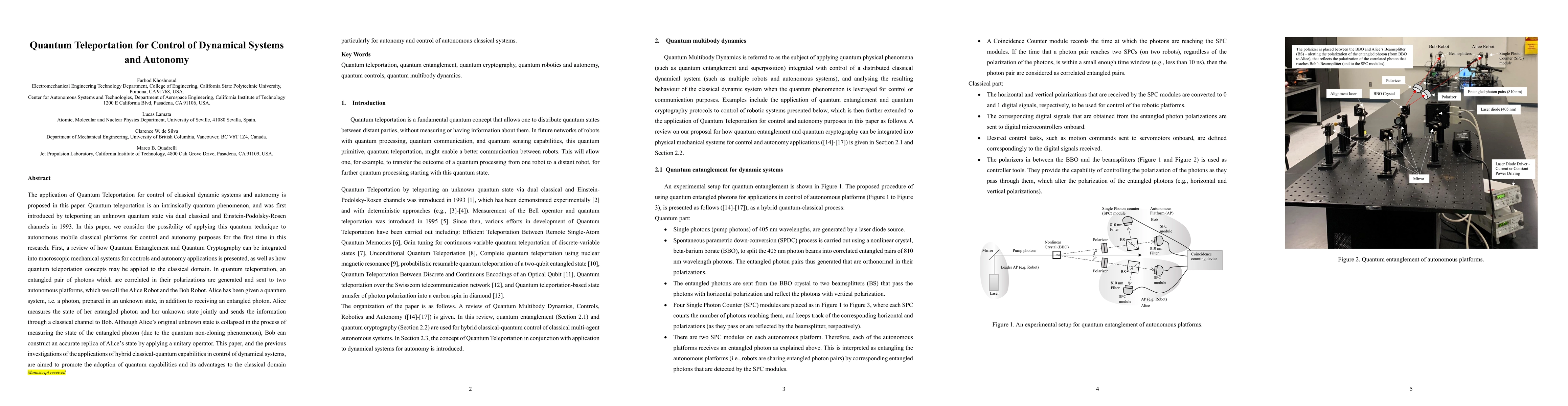 The application of Quantum Teleportation for control of classical dynamic systems and autonomy is proposed in this paper. Quantum teleportation is an intrinsically quantum phenomenon, and was first introduced by teleporting an unknown quantum state via dual classical and Einstein-Podolsky-Rosen channels in 1993. In this paper, we consider the possibility of applying this quantum technique to autonomous mobile classical platforms for control and autonomy purposes for the first time in this research. First, a review of how Quantum Entanglement and Quantum Cryptography can be integrated into macroscopic mechanical systems for controls and autonomy applications is presented, as well as how quantum teleportation concepts may be applied to the classical domain. In quantum teleportation, an entangled pair of photons which are correlated in their polarizations are generated and sent to two autonomous platforms, which we call the Alice Robot and the Bob Robot. Alice has been given a quantum system, i.e. a photon, prepared in an unknown state, in addition to receiving an entangled photon. Alice measures the state of her entangled photon and her unknown state jointly and sends the information through a classical channel to Bob. Although Alice original unknown state is collapsed in the process of measuring the state of the entangled photon (due to the quantum non-cloning phenomenon), Bob can construct an accurate replica of Alice state by applying a unitary operator. This paper, and the previous investigations of the applications of hybrid classical-quantum capabilities in control of dynamical systems, are aimed to promote the adoption of quantum capabilities and its advantages to the classical domain particularly for autonomy and control of autonomous classical systems.