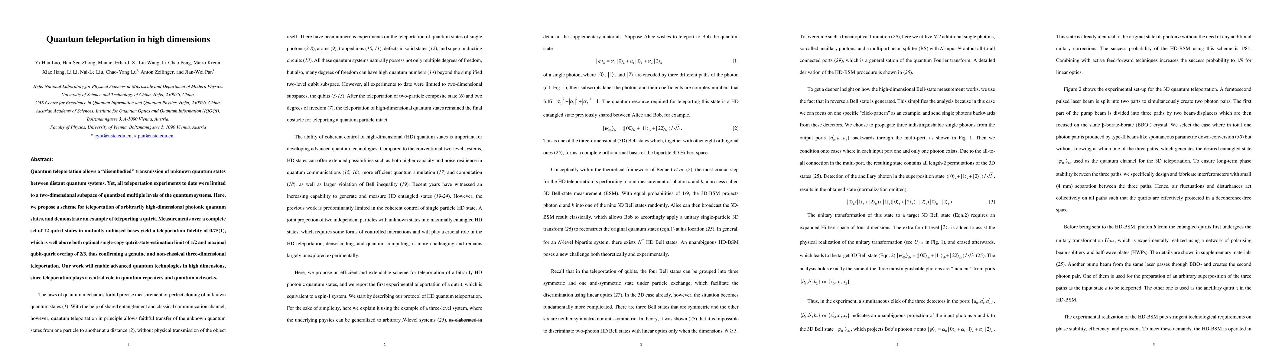 Precise measurement or perfect cloning of unknown quantum states is forbidden by the laws of quantum mechanics. Yet, quantum teleportation in principle allows for a faithful and disembodied transmission of unknown quantum states between distant quantum systems using entanglement. There have been numerous experiments on teleportation of quantum states of single photons, atoms, trapped ions, defects in solid states, and superconducting circuits. However, all demonstrations to date were limited to a two-dimensional subspace$-$so-called qubit$-$of the quantized multiple levels of the quantum systems. In general, a quantum particle can naturally possess not only multiple degrees of freedom, but also, many degrees of freedom can have high quantum number beyond the simplified two-level subspace. Here, making use of multiport beam-splitters and ancillary single photons, we propose a resource-efficient and extendable scheme for teleportation of arbitrarily high-dimensional photonic quantum states. We report the first experimental teleportation of a qutrit, which is equivalent to a spin-1 system. Measurements over a complete set of 12 states in mutually unbiased bases yield a teleportation fidelity of 0.75(1), well above the optimal single-copy qutrit-state-estimation limit of 1/2. The fidelity also exceeds the limit of 2/3, the maximum possible for explanation through qubits only. Thus, we strictly prove a genuine three-dimensional, universal, and highly non-classical quantum teleportation. Combining previous methods of teleportation of two-particle composite states and multiple degrees of freedom, our work provides a complete toolbox for teleporting a quantum particle intact. We expect that our results will pave the way for quantum technology applications in high dimensions, since teleportation plays a central role in quantum repeaters and quantum networks.