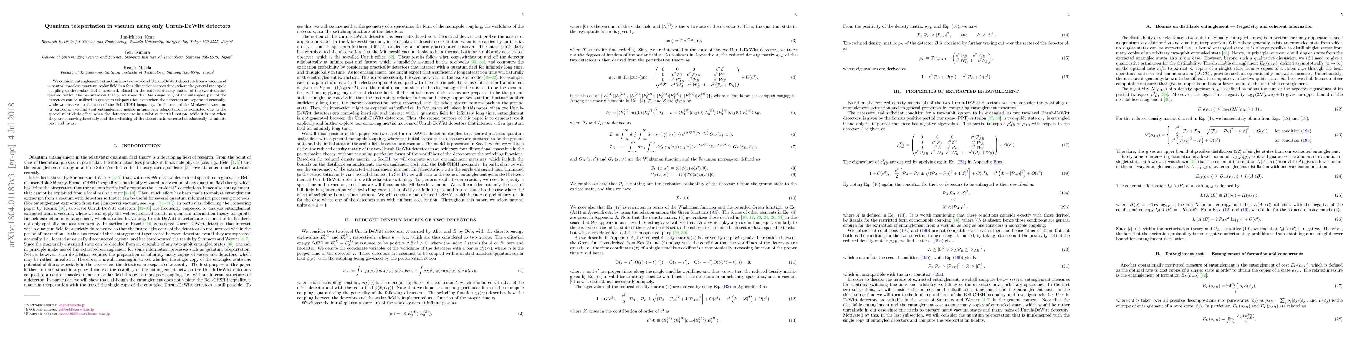 This paper explores quantum teleportation in vacuum using Unruh-DeWitt detectors, demonstrating that entanglement can be extracted from a neutral massless scalar field and utilized for teleportation without violating Bell-CHSH inequalities. Special relativistic effects enable entanglement extraction when detectors are in relative motion, but not when they are comoving.