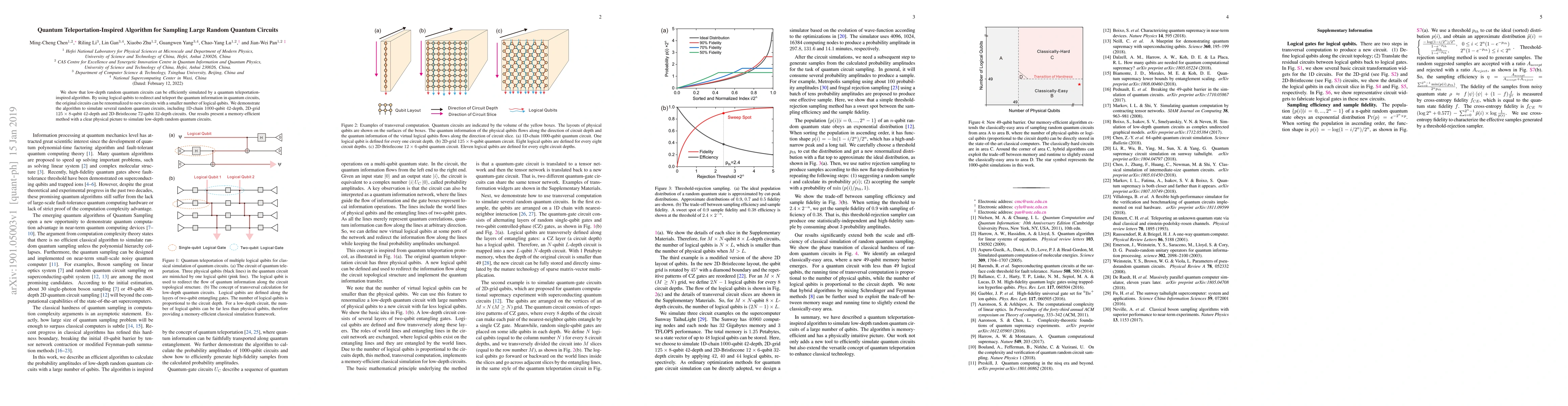 This paper proposes a quantum teleportation-inspired algorithm to efficiently simulate low-depth random quantum circuits by renormalizing them using logical qubits, demonstrating its effectiveness on various circuit types, and presenting a memory-efficient method for such simulations.