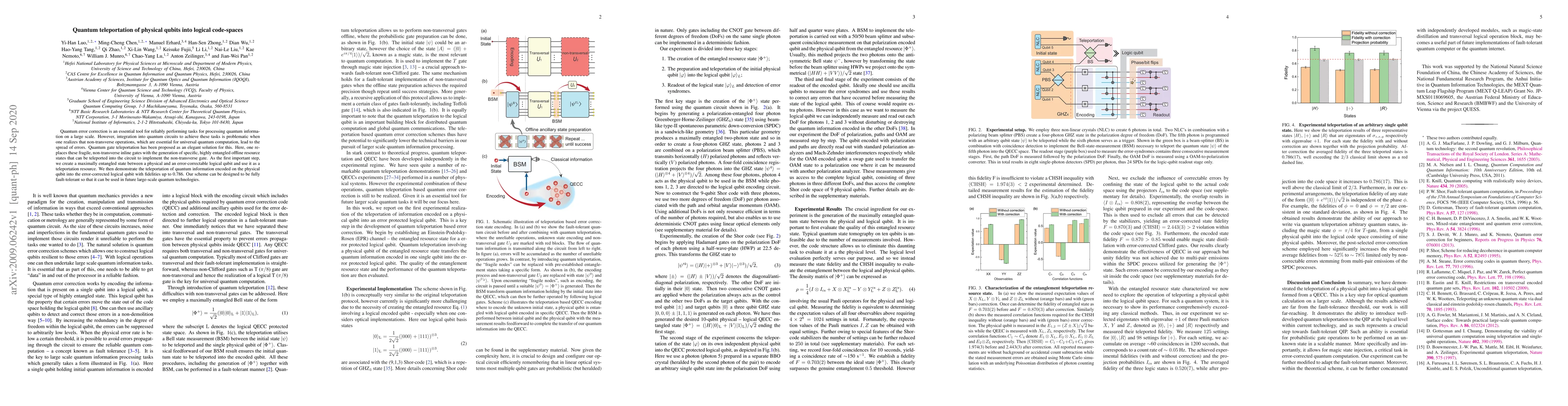Quantum error correction is an essential tool for reliably performing tasks for processing quantum information on a large scale. However, integration into quantum circuits to achieve these tasks is problematic when one realizes that non-transverse operations, which are essential for universal quantum computation, lead to the spread of errors. Quantum gate teleportation has been proposed as an elegant solution for this. Here, one replaces these fragile, non-transverse inline gates with the generation of specific, highly entangled offline resource states that can be teleported into the circuit to implement the non-transverse gate. As the first important step, we create a maximally entangled state between a physical and an error-correctable logical qubit and use it as a teleportation resource. We then demonstrate the teleportation of quantum information encoded on the physical qubit into the error-corrected logical qubit with fidelities up to 0.786. Our scheme can be designed to be fully fault-tolerant so that it can be used in future large-scale quantum technologies.