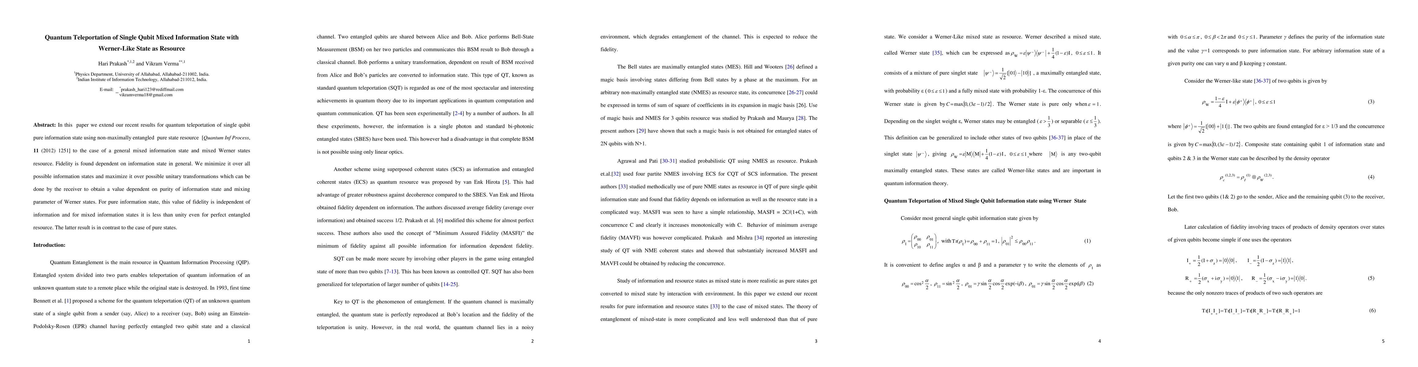 This paper extends quantum teleportation to mixed information states using mixed Werner states as resources, finding fidelity dependent on the state's purity and Werner state mixing parameter. The optimal fidelity for mixed states is less than unity, contrasting with the fidelity for pure states.