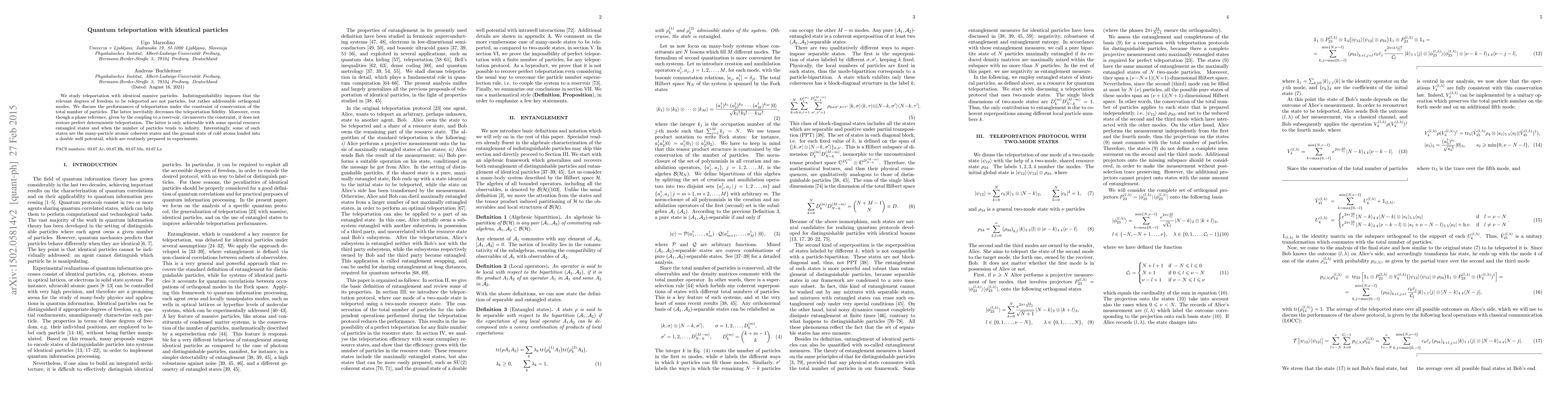 Quantum teleportation with identical particles is possible but limited by conservation of total particle number, which decreases fidelity. Achievable only with special entangled states under infinite particle limit.