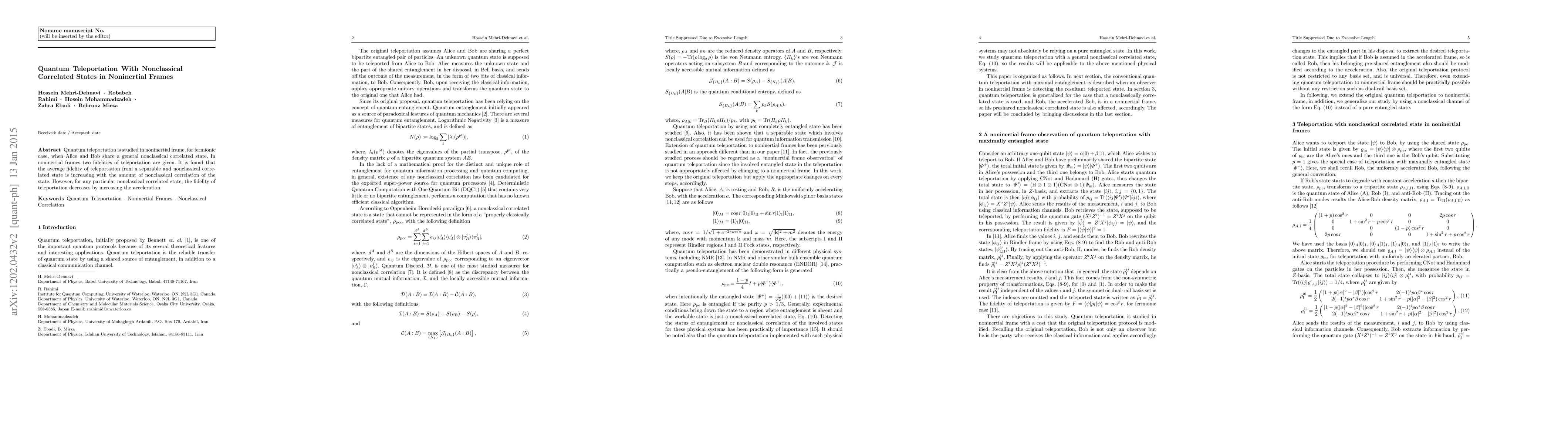 Summary: This study investigates quantum teleportation in noninertial frames for fermions, finding that teleportation fidelity improves with nonclassical correlation but decreases with increased acceleration. Two fidelities are analyzed, highlighting the impact of nonclassical states and frame dynamics on teleportation.