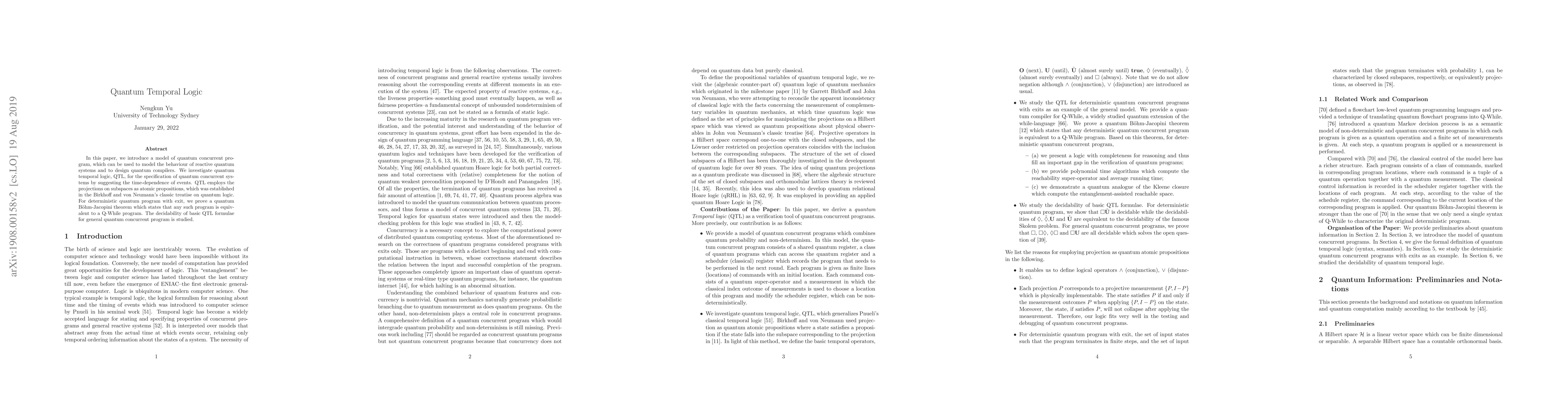 In this paper, we introduce a model of quantum concurrent program, which can be used to model the behaviour of reactive quantum systems and to design quantum compilers. We investigate quantum temporal logic, QTL, for the specification of quantum concurrent systems by suggesting the time-dependence of events. QTL employs the projections on subspaces as atomic propositions, which was established in the Birkhoff and von Neumann's classic treatise on quantum logic. For deterministic functional quantum program, We prove a quantum B\"{o}hm-Jacopini theorem which states that any such program is equivalent to a Q-While program. The decidability of basic QTL formulae for general quantum concurrent program is studied.