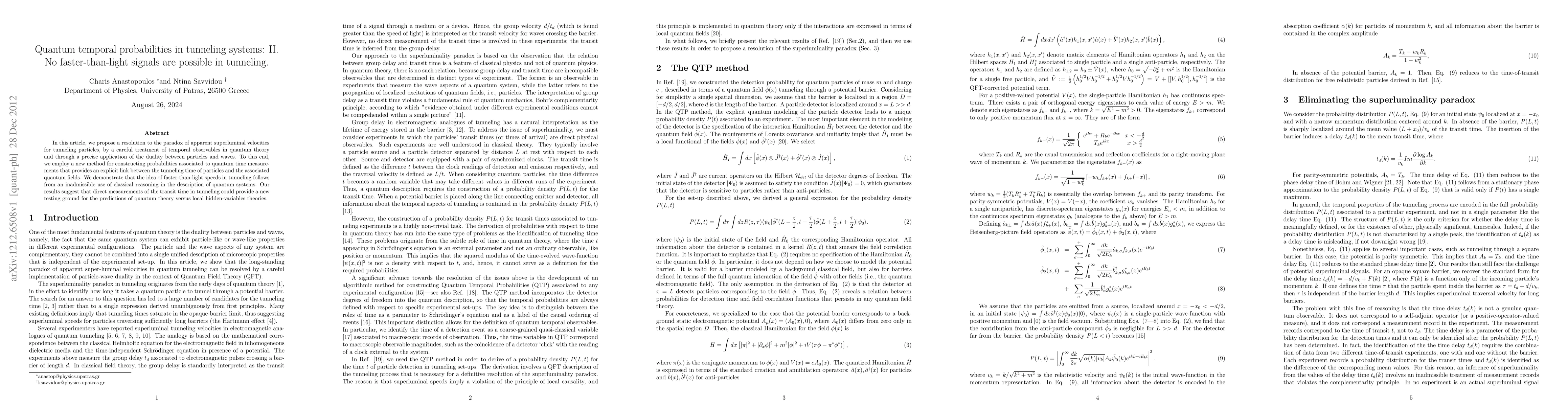 This paper resolves the paradox of apparent superluminal velocities in tunneling particles by introducing a new method for quantum temporal probabilities, showing that faster-than-light signals are not possible. It suggests that direct tunneling time measurements could test quantum theory against local hidden-variable theories.