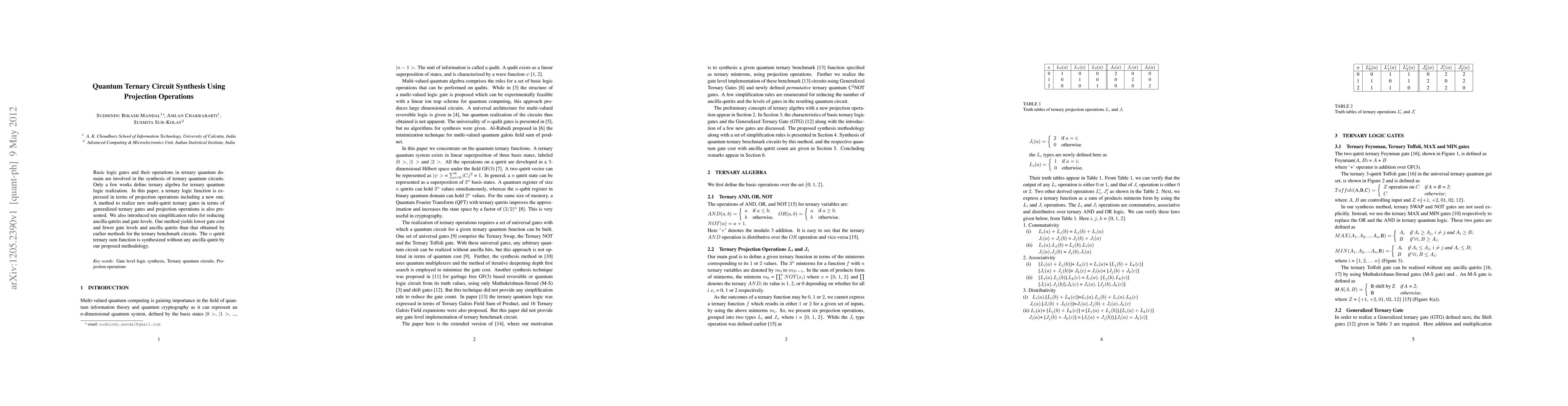 This paper presents a novel method for synthesizing ternary quantum circuits using projection operations, including a new type. It introduces ten simplification rules to reduce gate levels and ancilla qutrits, achieving lower gate costs and fewer gate levels compared to prior methods, with the $n$ qutrit ternary sum function synthesized without any ancilla qutrits.