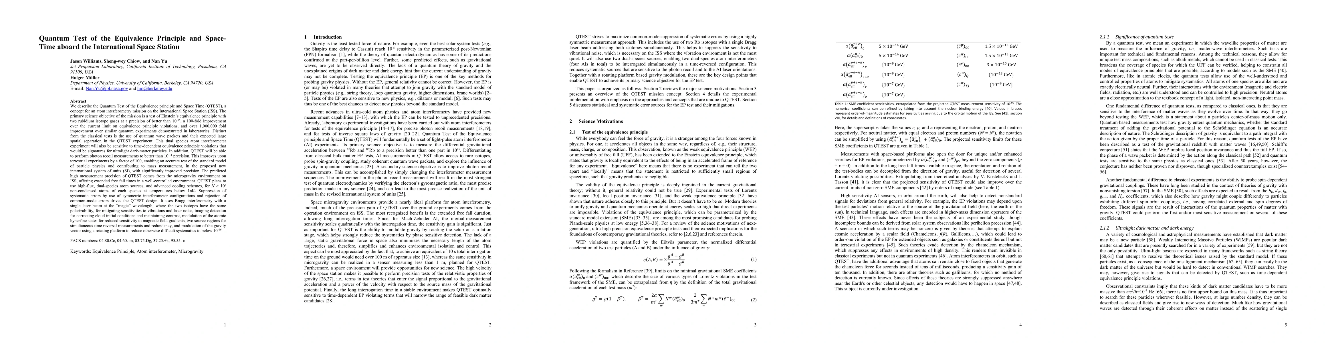 The QTEST mission aims to test Einstein's equivalence principle with high precision using atom interferometry aboard the ISS, employing rubidium isotopes to achieve a sensitivity level of better than 10$^{-15}$. The experiment also seeks to detect time-dependent violations indicative of ultralight dark matter and improve photon recoil measurements by a factor of 100.