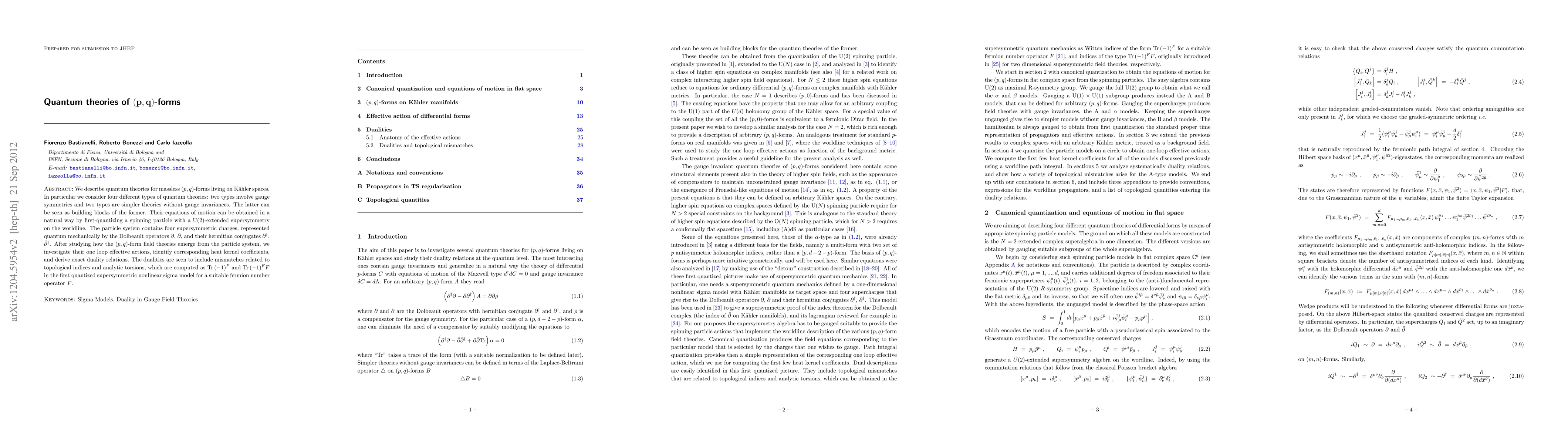 We describe quantum theories for massless (p,q)-forms living on Kaehler spaces. In particular we consider four different types of quantum theories: two types involve gauge symmetries and two types are simpler theories without gauge invariances. The latter can be seen as building blocks of the former. Their equations of motion can be obtained in a natural way by first-quantizing a spinning particle with a U(2)-extended supersymmetry on the worldline. The particle system contains four supersymmetric charges, represented quantum mechanically by the Dolbeault operators and their hermitian conjugates. After studying how the (p,q)-form field theories emerge from the particle system, we investigate their one loop effective actions, identify corresponding heat kernel coefficients, and derive exact duality relations. The dualities are seen to include mismatches related to topological indices and analytic torsions, which are computed as Tr(-1)^F and Tr[(-1)^F F] in the first quantized supersymmetric nonlinear sigma model for a suitable fermion number operator F.
