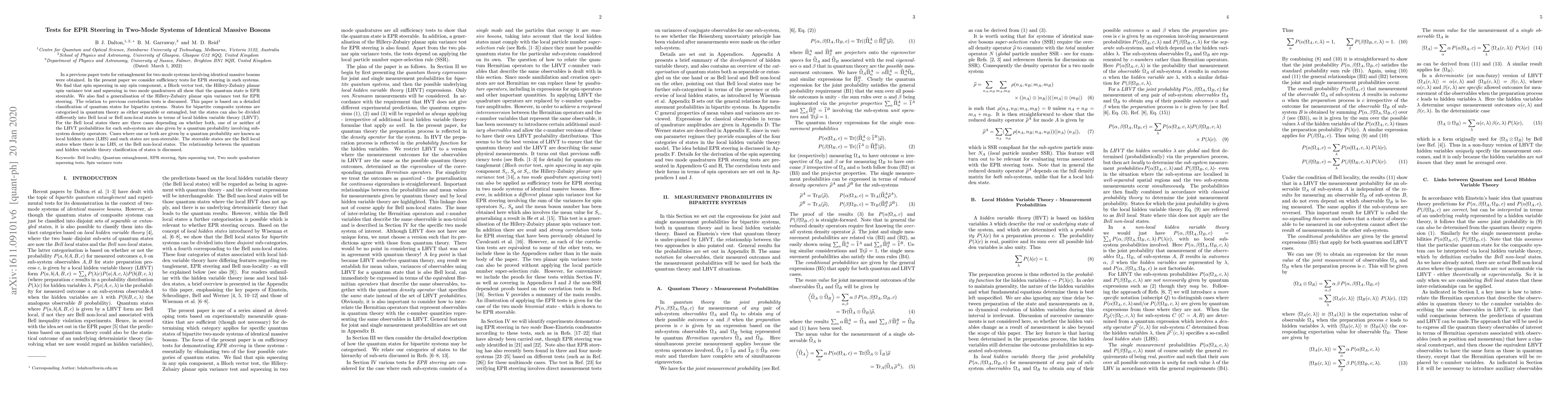 This paper explores sufficiency tests for EPR steering in two-mode systems involving identical massive bosons, demonstrating that spin squeezing, Bloch vector tests, and planar spin variance tests indicate EPR steerability. It also generalizes the Hillery-Zubairy planar spin variance test for this purpose, and discusses the relationship between quantum and local hidden variable theory classifications of bipartite states.