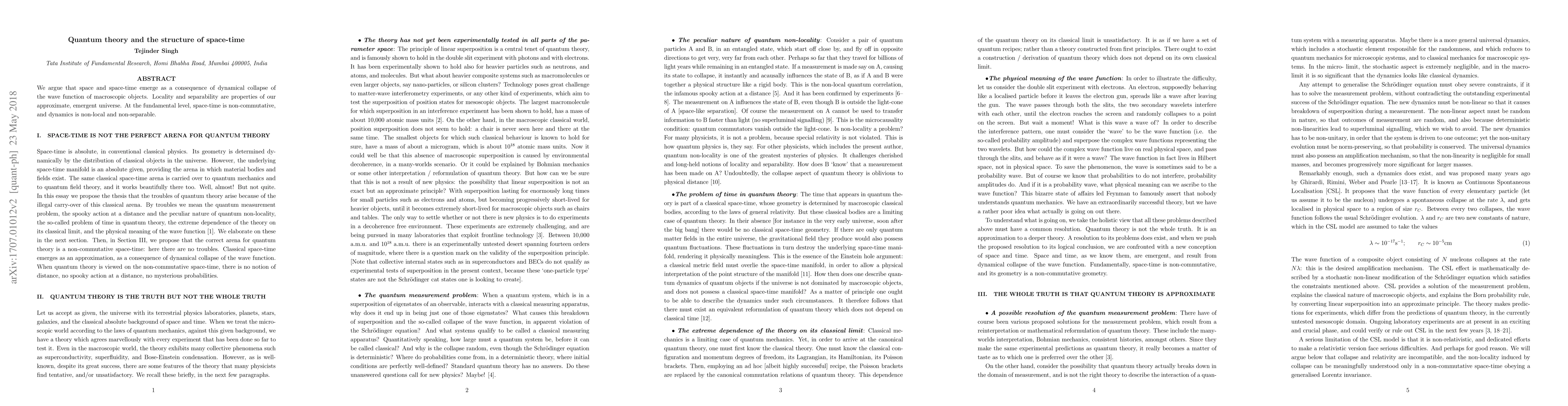 Research argues that space and time emerge from the collapse of a macroscopic object's wave function, with fundamental space-time being non-commutative and dynamics non-local and non-separable.