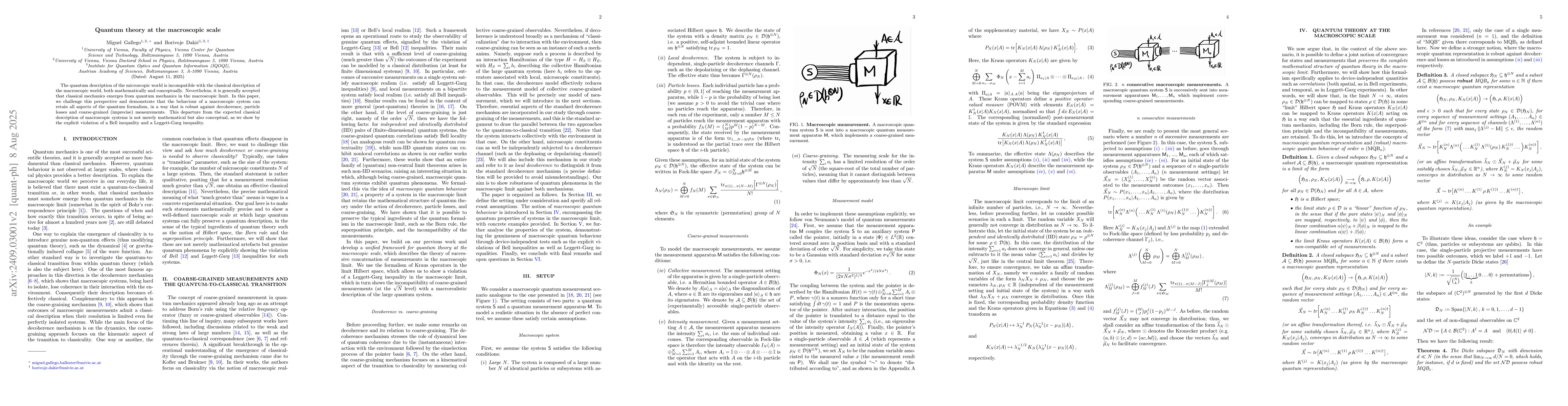 The quantum description of the microscopic world is incompatible with the classical description of the macroscopic world, both mathematically and conceptually. Nevertheless, it is generally accepted that classical mechanics emerges from quantum mechanics in the macroscopic limit. In this letter, we challenge this perspective and demonstrate that the behavior of a macroscopic system can retain all aspects of the quantum formalism, in a way that is robust against decoherence, particle losses and coarse-grained (imprecise) measurements. This departure from the expected classical description of macroscopic systems is not merely mathematical but also conceptual, as we show by the explicit violation of a Bell inequality and a Leggett-Garg inequality.