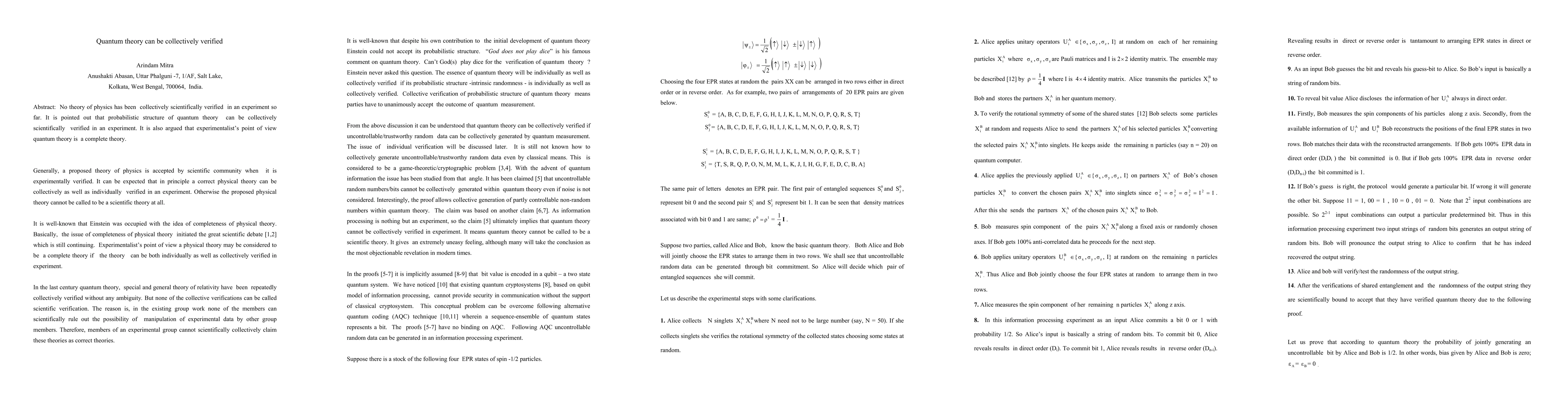 No theory of physics has been collectively scientifically verified in an experiment so far. It is pointed out that probabilistic structure of quantum theory can be collectively scientifically verified in an experiment. It is also argued that experimentalist point of view quantum theory is a complete theory.
