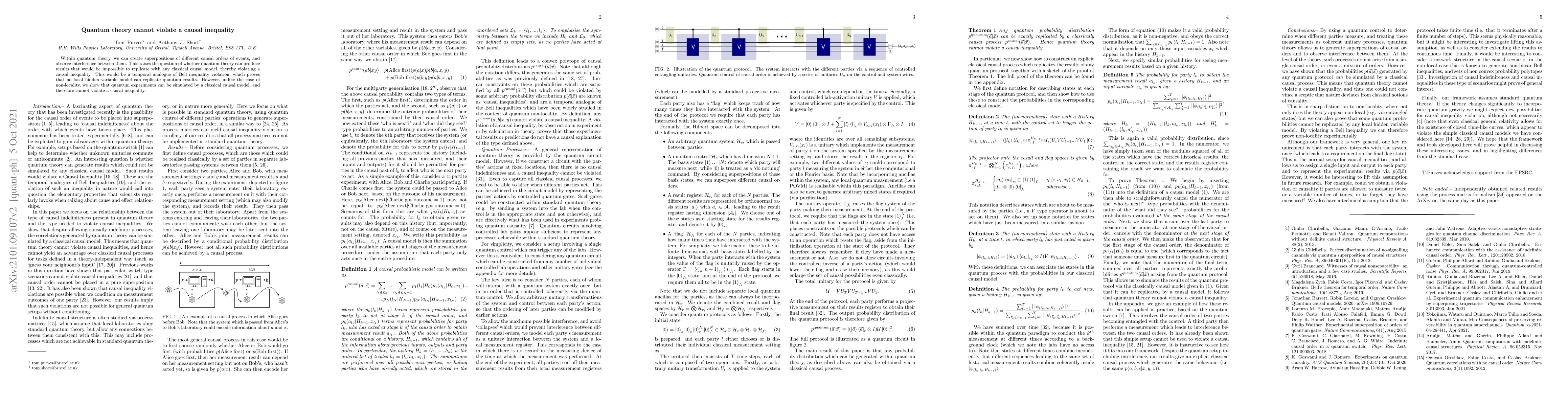 This paper argues that quantum theory, despite allowing superpositions of different causal orders, can still be simulated by a classical causal model, thus it cannot violate a causal inequality, akin to how classical models can replicate quantum results without violating Bell inequalities.
