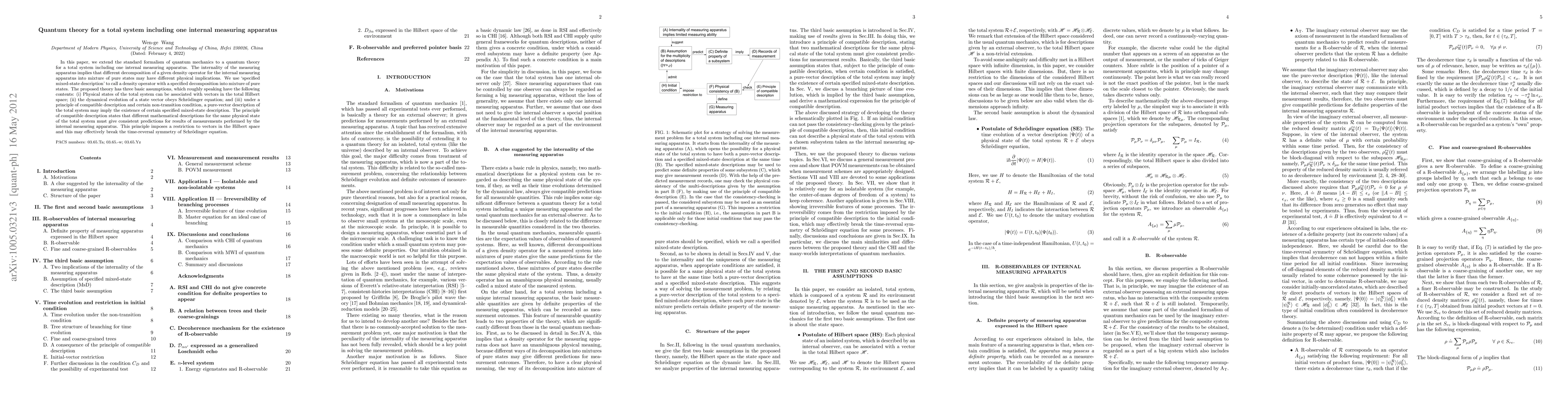 In this paper, we extend the standard formalism of quantum mechanics to a quantum theory for a total system including one internal measuring apparatus. The internality of the measuring apparatus implies that different decomposition of a given density operator for the internal measuring apparatus into mixture of pure states may have different physical implications. We use `specified mixed-state description' to call a density operator with a specified decomposition into mixture of pure states. The proposed theory has three basic assumptions, which roughly speaking have the following contents: (i) Physical states of the total system can be associated with vectors in the total Hilbert space; (ii) the dynamical evolution of a state vector obeys Schr\"{o}dinger equation; and (iii) under a principle of compatible description and certain non-transition condition, a pure-vector description of the total system may imply the existence of certain specified mixed-state description. The principle of compatible description states that different mathematical descriptions for the same physical state of the total system must give consistent predictions for results of measurements performed by the internal measuring apparatus. This principle imposes a restriction to vectors in the Hilbert space and this may effectively break the time-reversal symmetry of Schr\"{o}dinger equation.