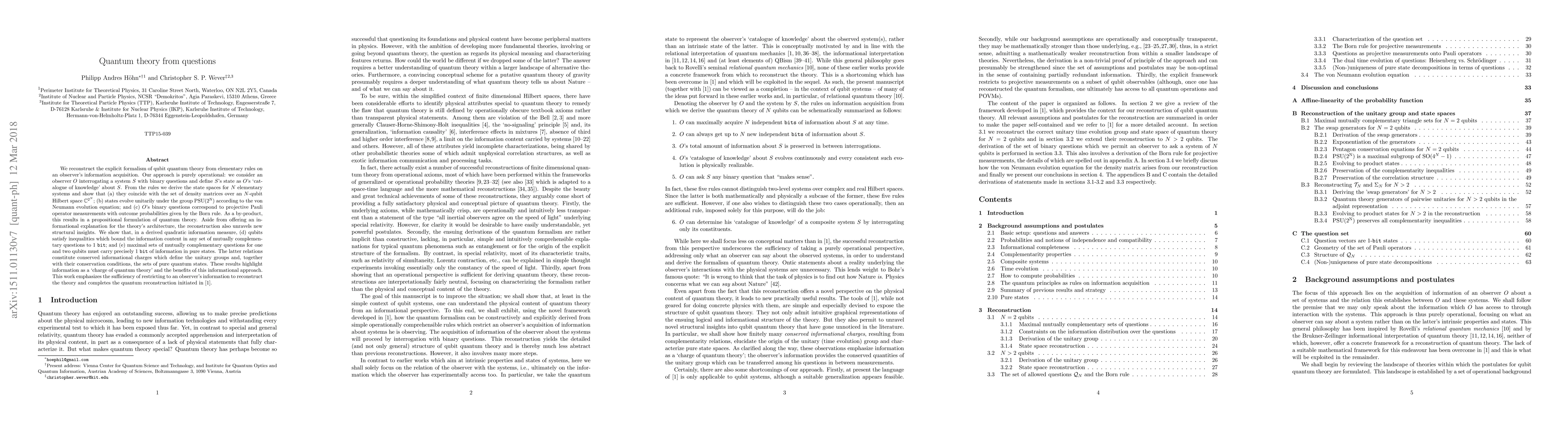 We reconstruct the explicit formalism of qubit quantum theory from elementary rules on an observer's information acquisition. Our approach is purely operational: we consider an observer O interrogating a system S with binary questions and define S's state as O's `catalogue of knowledge' about S. From the rules we derive the state spaces for N elementary systems and show that (a) they coincide with the set of density matrices over an N-qubit Hilbert space; (b) states evolve unitarily under the group $\rm{PSU}(2^N)$ according to the von Neumann evolution equation; and (c) O's binary questions correspond to projective Pauli operator measurements with outcome probabilities given by the Born rule. As a by-product, this results in a propositional formulation of quantum theory. Aside from offering an informational explanation for the theory's architecture, the reconstruction also unravels new structural insights. We show that, in a derived quadratic information measure, (d) qubits satisfy inequalities which bound the information content in any set of mutually complementary questions to 1 bit; and (e) maximal sets of mutually complementary questions for one and two qubits must carry precisely 1 bit of information in pure states. The latter relations constitute conserved informational charges which define the unitary groups and, together with their conservation conditions, the sets of pure quantum states. These results highlight information as a `charge of quantum theory' and the benefits of this informational approach. This work emphasizes the sufficiency of restricting to an observer's information to reconstruct the theory and completes the quantum reconstruction initiated in arXiv:1412.8323.