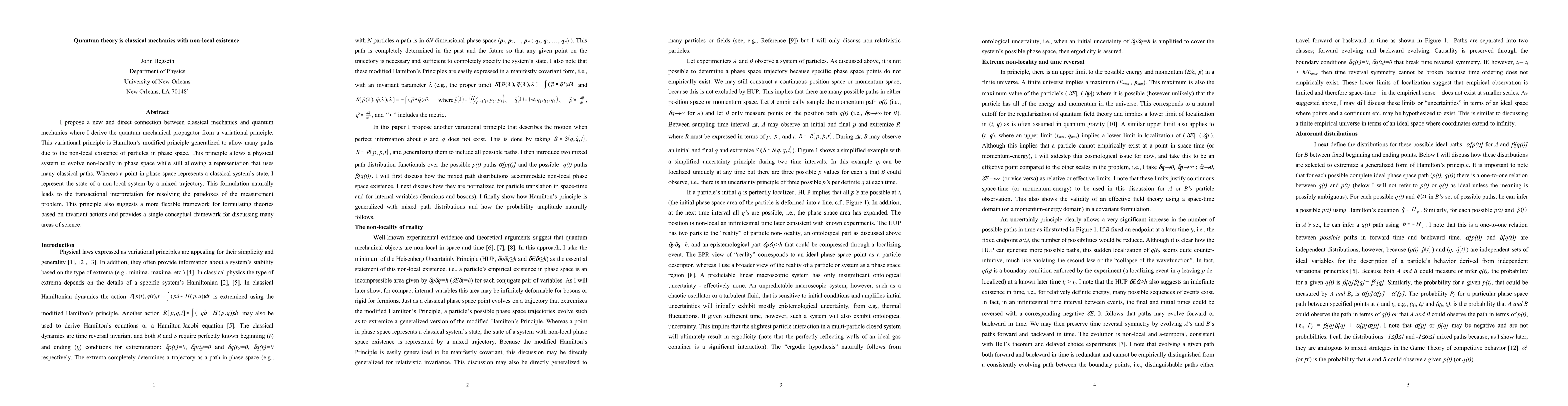 I propose a new and direct connection between classical mechanics and quantum mechanics where I derive the quantum mechanical propagator from a variational principle. This variational principle is Hamilton's modified principle generalized to allow many paths due to the non-local existence of particles in phase space. This principle allows a physical system to evolve non-locally in phase space while still allowing a representation that uses many classical paths. Whereas a point in phase space represents a classical system's state, I represent the state of a non-local system by a mixed trajectory. This formulation naturally leads to the transactional interpretation for resolving the paradoxes of the measurement problem. This principle also suggests a more flexible framework for formulating theories based on invariant actions and provides a single conceptual framework for discussing many areas of science.